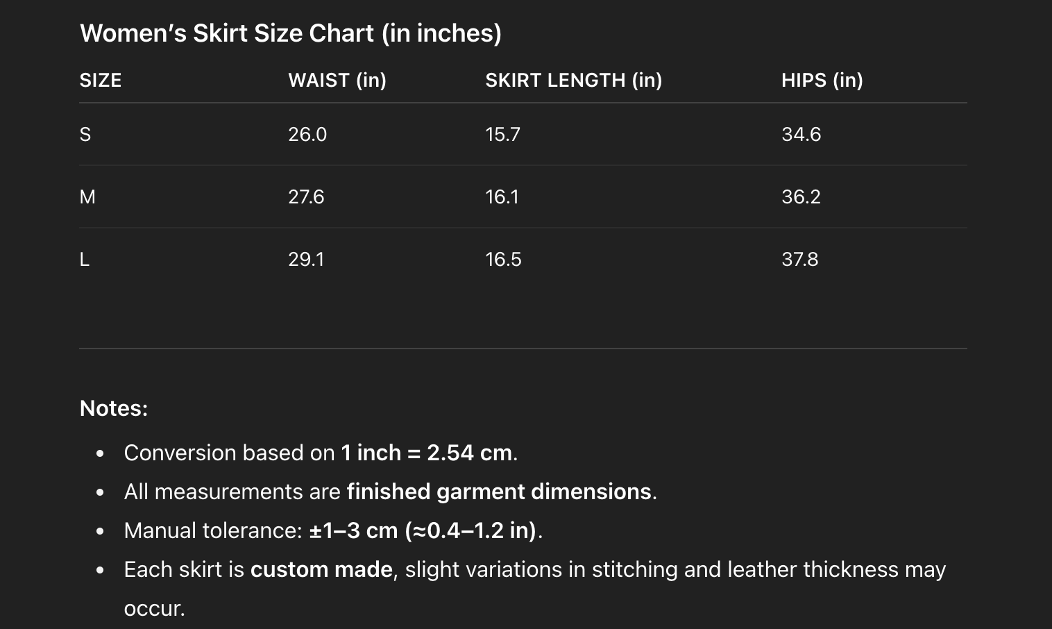 - Custom Sizing: If your size isn’t available in the chart, choose "Custom" for a tailor-made leather skirt