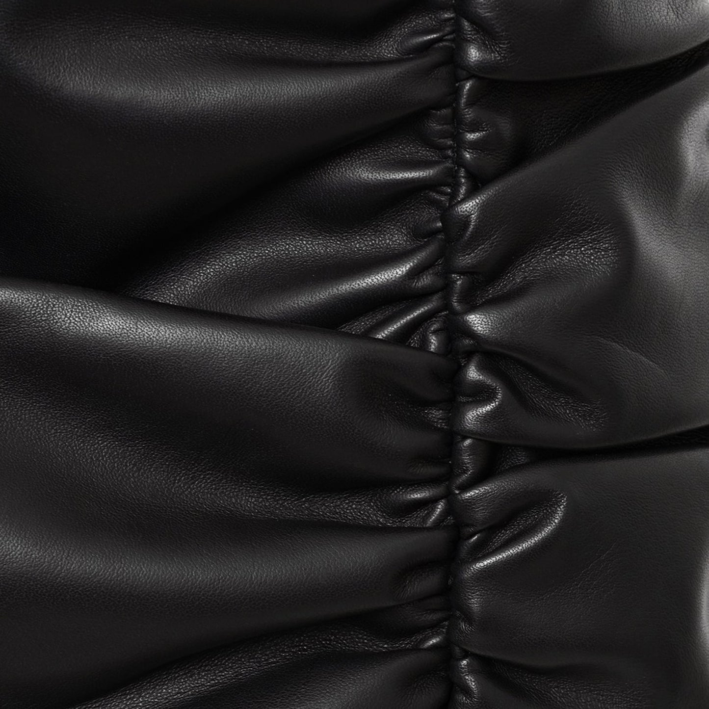 Add flair to your wardrobe with this leather mini skirt featuring ruched details.