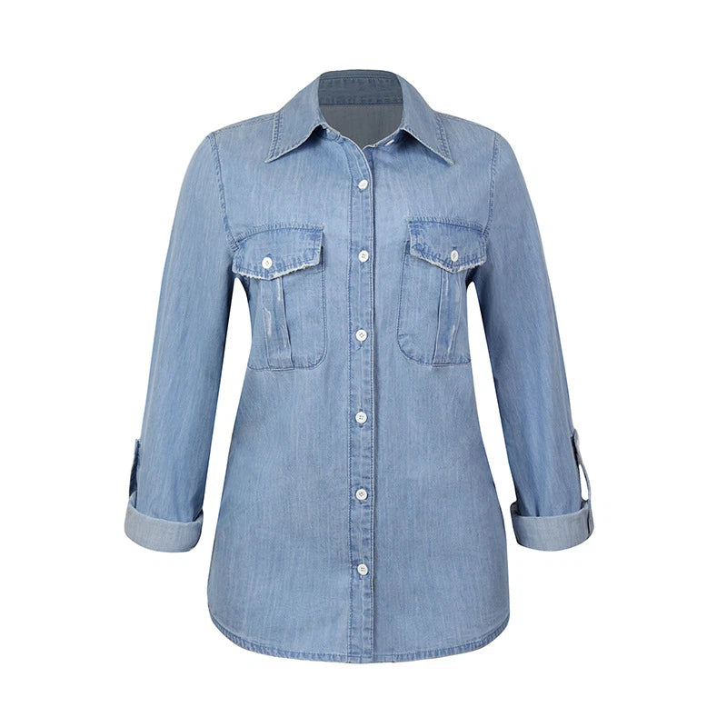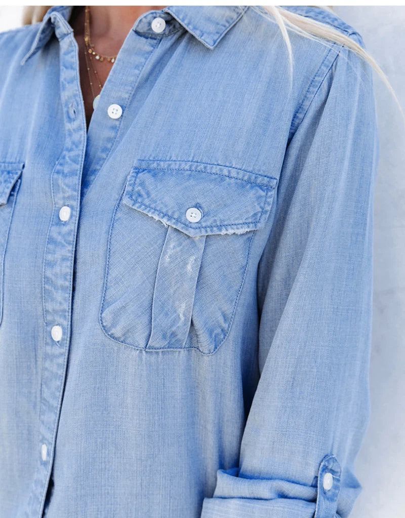 Women denim shirts with full front button closure – easy to wear open or closed for everyday outfits - Classic women jeans shirt featuring long sleeves with tab-button roll-up design for warmer days