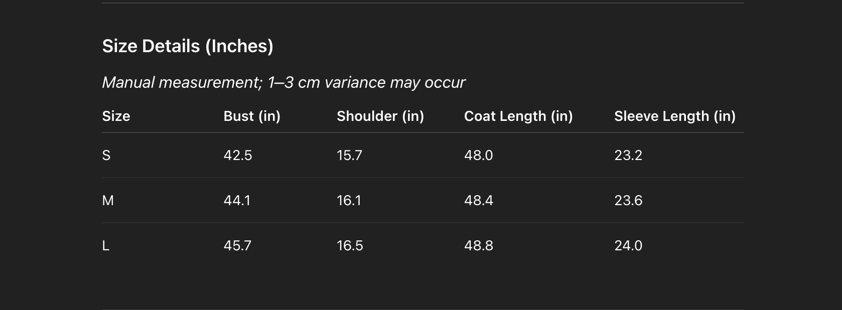 - Please review the size chart carefully before ordering. If you need assistance, message us anytime. Each long woolen coat requires high skill and materials, and margins are very small