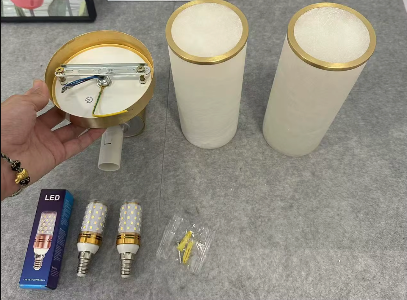 - Hardwired wall sconce with E27 spiral socket (5W × 2) supporting 110–240V LED bulbs.