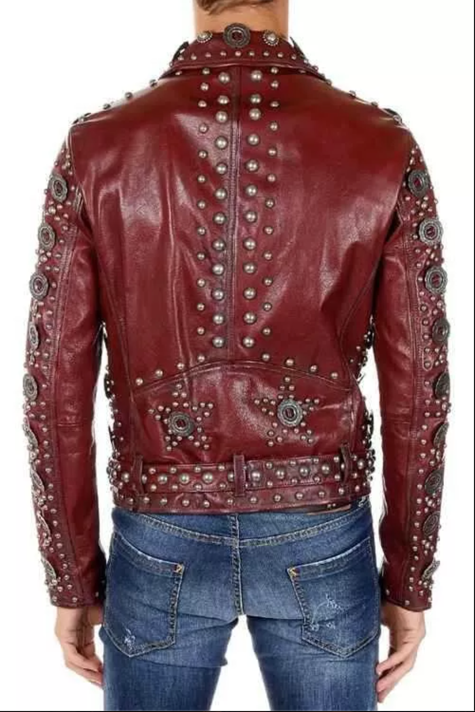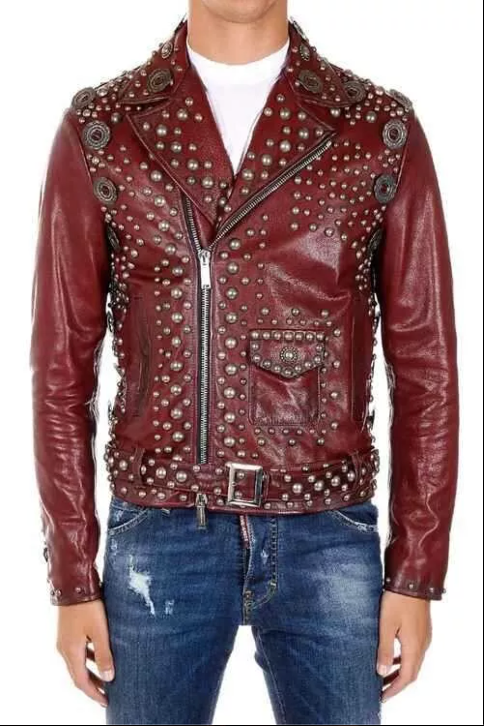 - Striking Color Contrast: The vibrant maroon leather paired with gleaming metal studs creates a stunning contrast, making this jacket a standout piece in any collection.