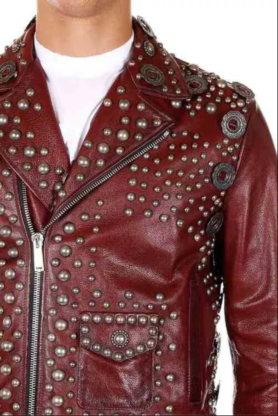 Add an edge to your wardrobe with this maroon leather jacket featuring bold metal studs.