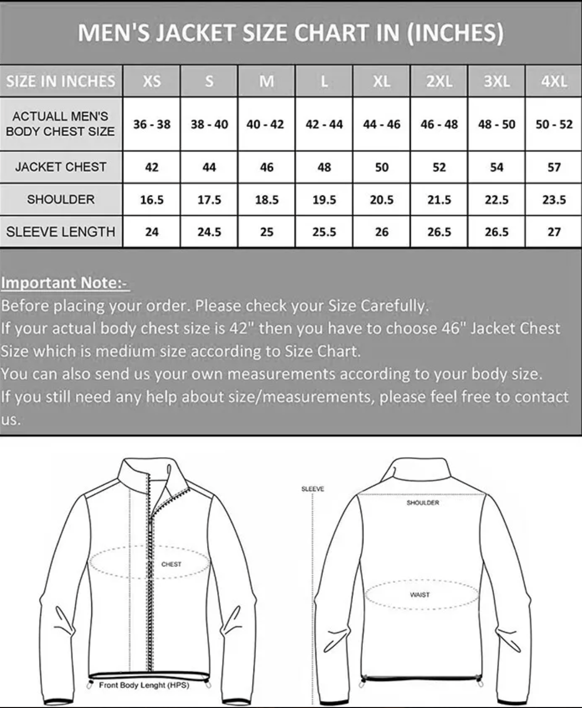 - Tailor-Made Option: If your size isn't available in the chart, select custom sizing to receive a perfectly tailored punk leather jacket made just for you.