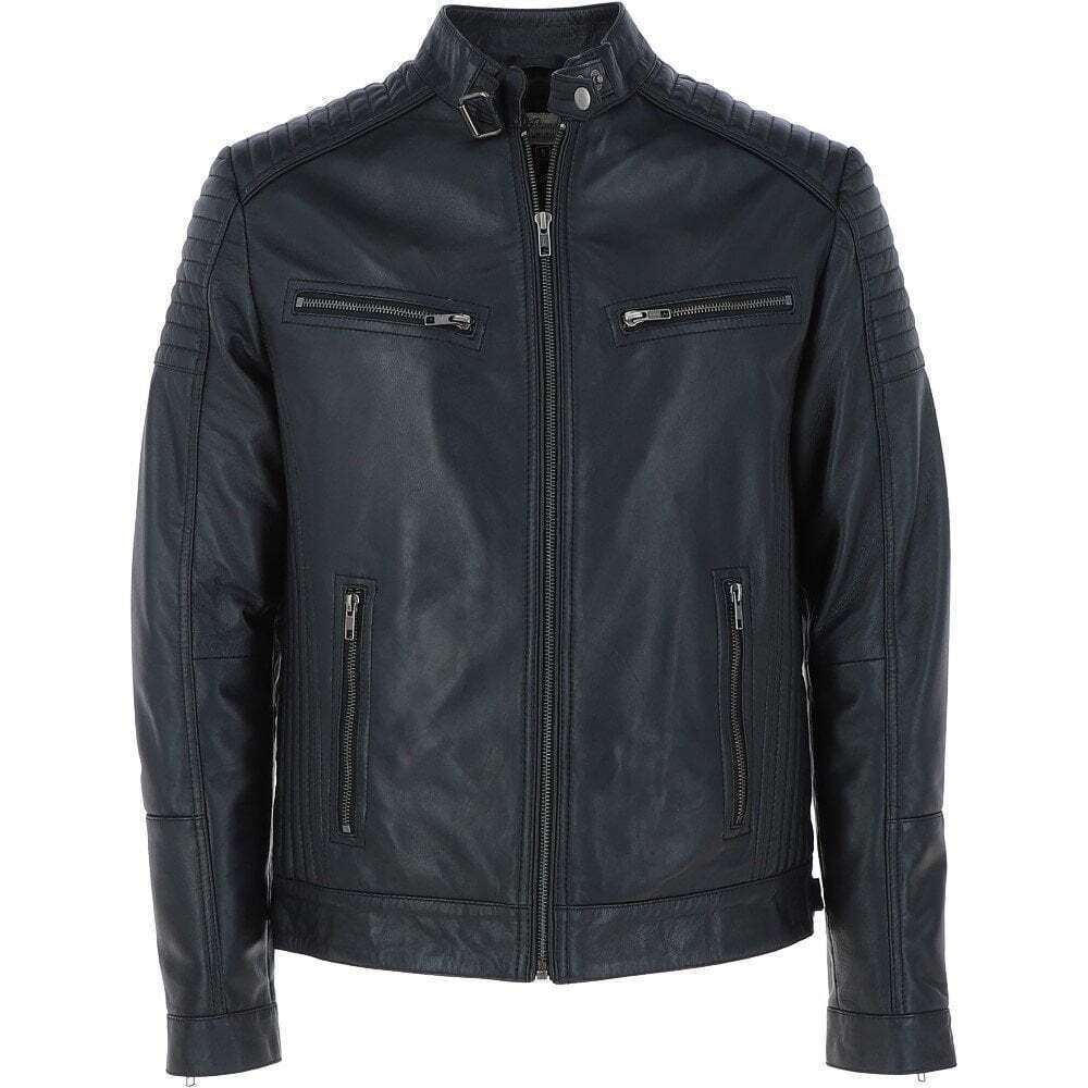 A sleek leather jacket designed with zippered pockets and a durable, lightweight structure.