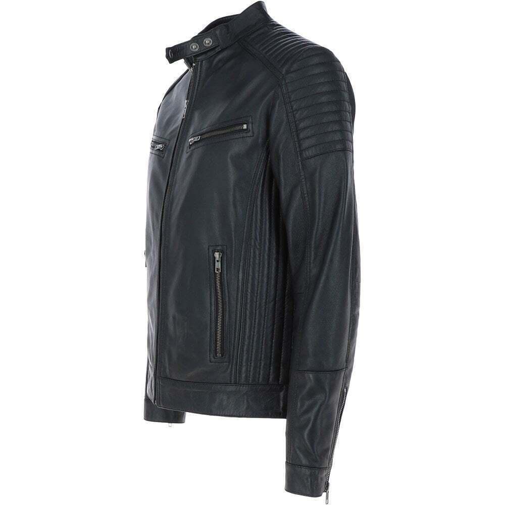 Mens black leather jacket genuine sheepskin slim fit biker design