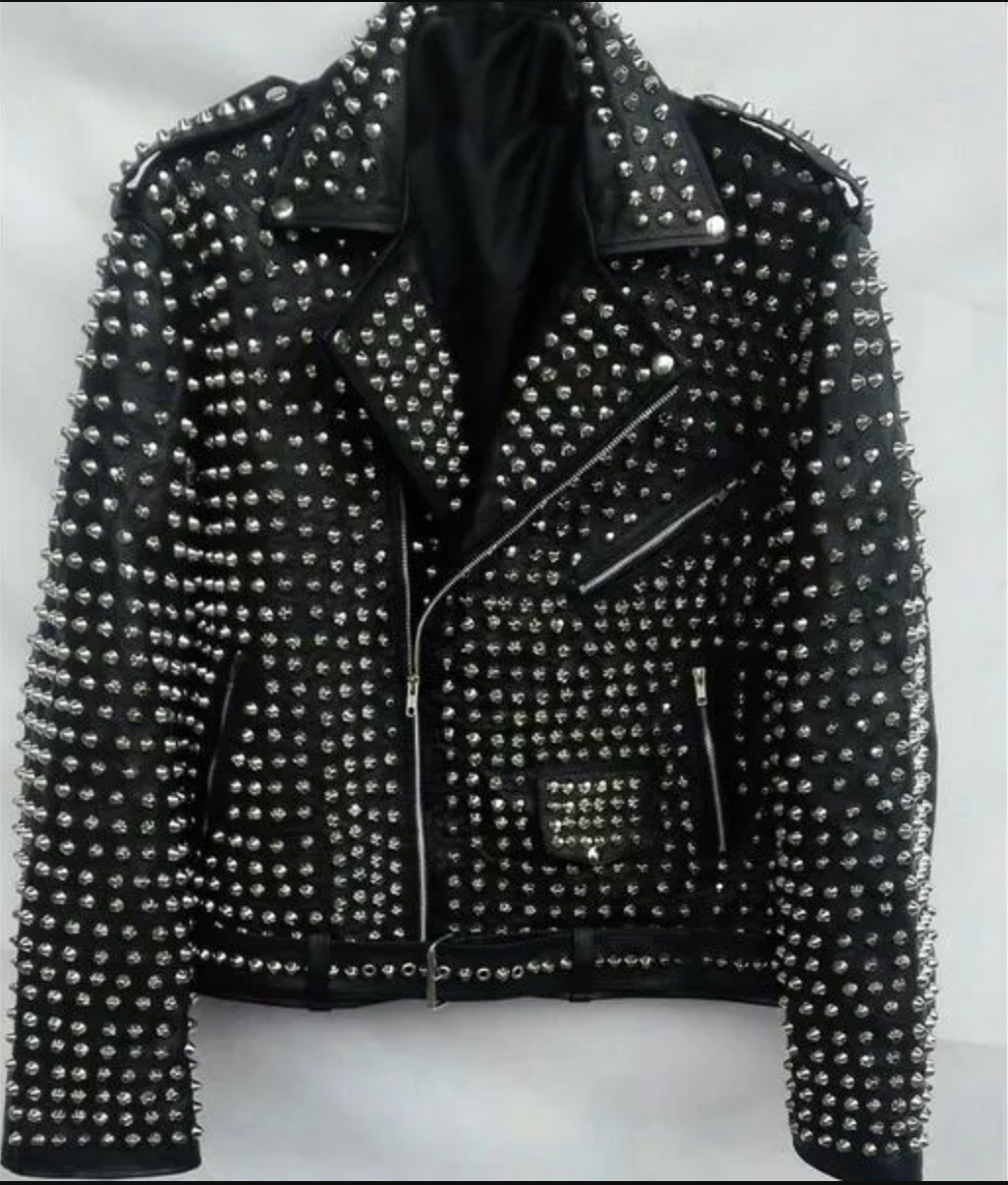 - Bold Black Leather Jacket with silver studs and spikes, perfect for heavy metal and biker enthusiasts.