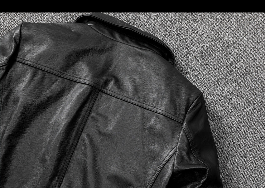 • Genuine top layer cowhide leather used for this men leather jacket, showing a natural grain finish visible across the body panels