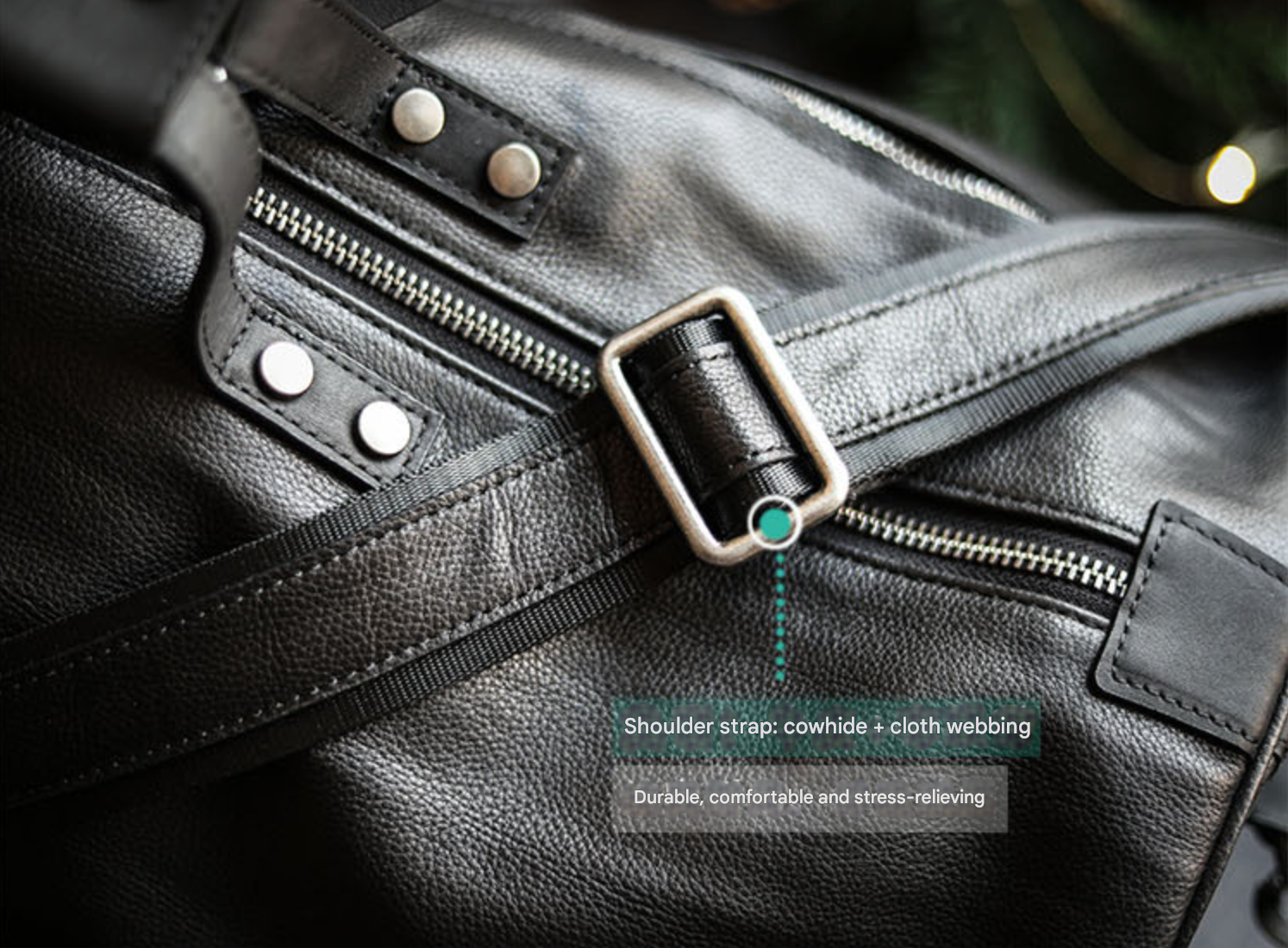- Shoulder strap made from cowhide + woven webbing — ensures comfort and long carrying sessions.
