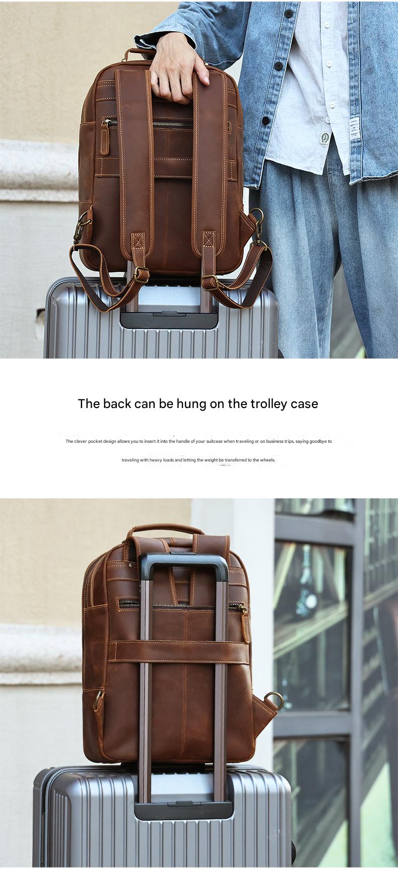 - Leather travel backpack for men includes trolley sleeve for easy attachment to suitcase handles during trips