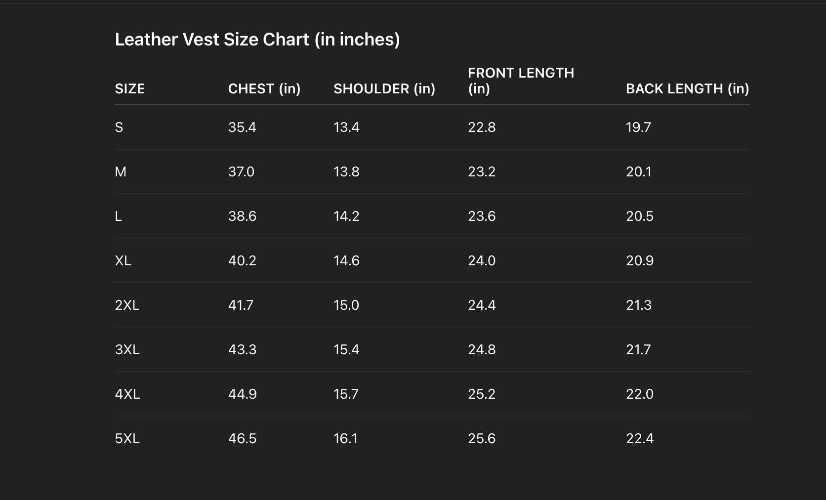 - Please make sure to select the correct size from the chart provided. If you need any assistance, feel free to message us. Each men leather vest involves significant cost and craftsmanship, and we work on very small margins.