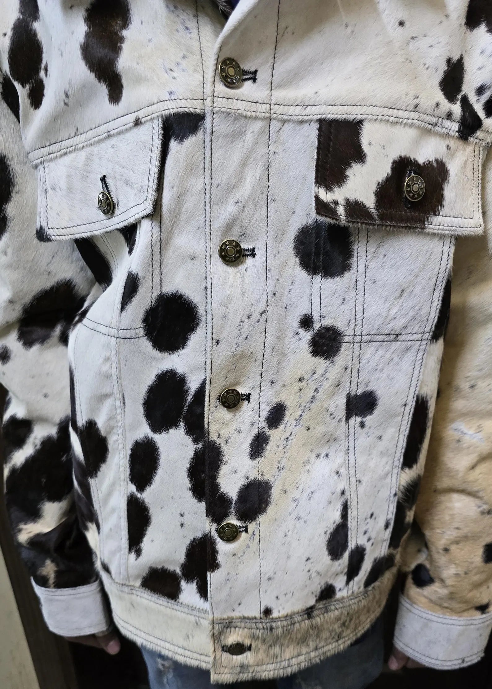Bring the spirit of the ranch into your wardrobe with this genuine cowhide jacket. Featuring bold black and white cow print hide, each men's cowhide jacket is handmade using real cow fur, making every piece unique in its spots and texture. With a traditional denim jacket cut and front brass button closure, this coat blends western roots with street-style edge. The natural cowhide finish gives off a raw, untamed vibe perfect for rodeo outfits or daily wear.