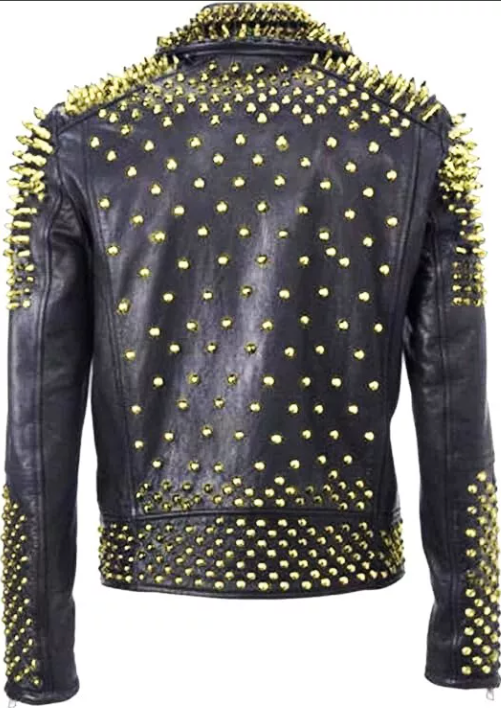 The men's punk golden studded spiked leather jacket is the ultimate fusion of punk rock attitude and timeless biker aesthetics. Designed for those who aren't afraid to stand out, this striking leather jacket takes bold fashion to a whole new level. Every inch of this piece is meticulously crafted to command attention, featuring an array of gold studs and spikes that emphasize its rebellious and fearless nature.