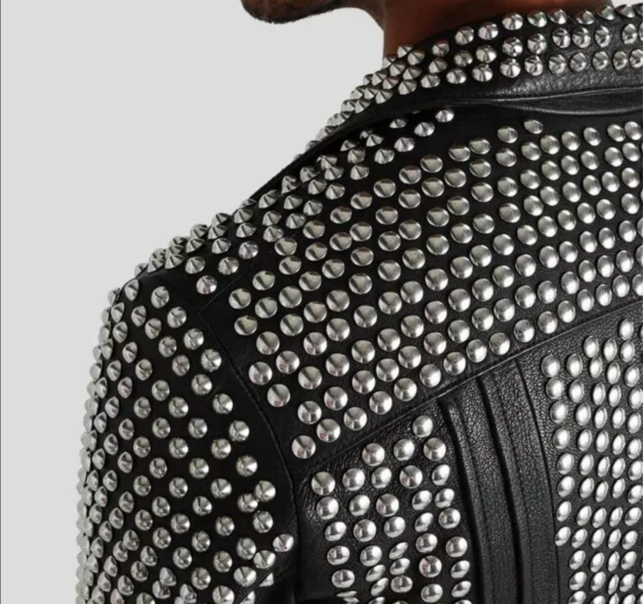 - Silver Stud Embellishments: Rows of silver-tone studs intricately placed on shoulders, sleeves, and lapels, adding a sharp, rebellious touch.