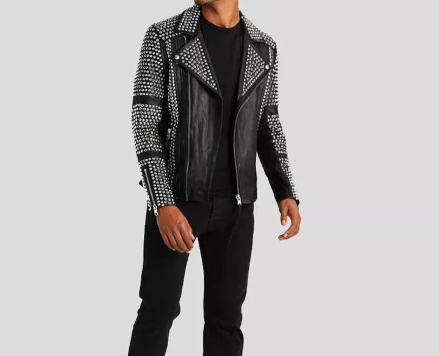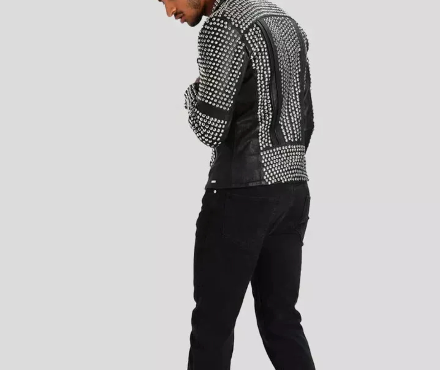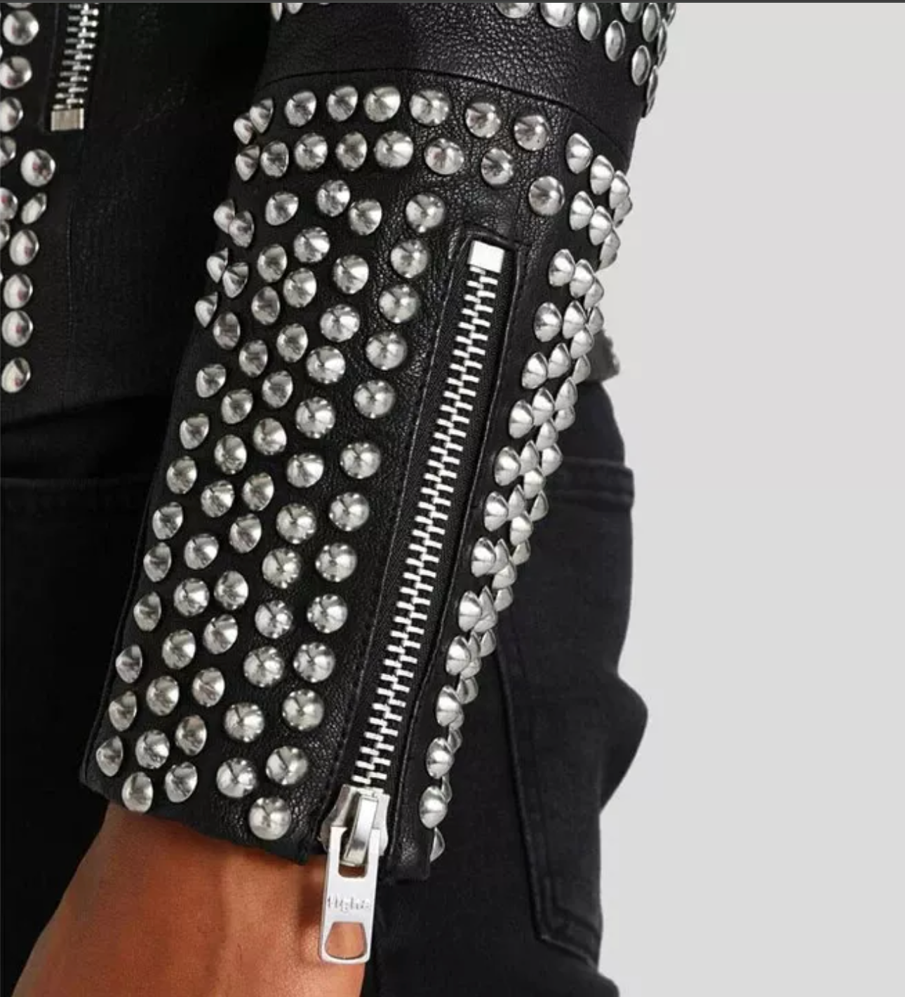 - Polished Silver Hardware: Matching silver-tone studs and zippers throughout the jacket for a cohesive, eye-catching finish.