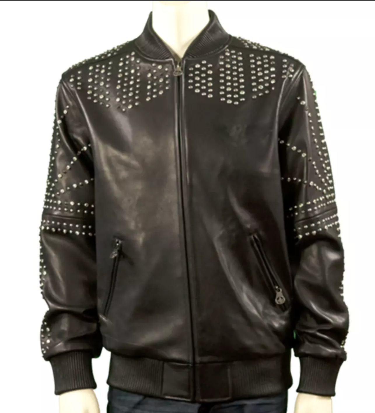 A bold black leather jacket adorned with metallic studs, designed for bikers who want to stand out.
