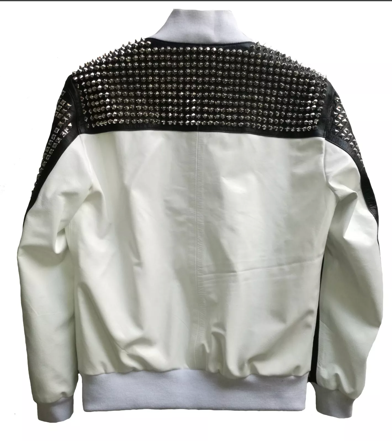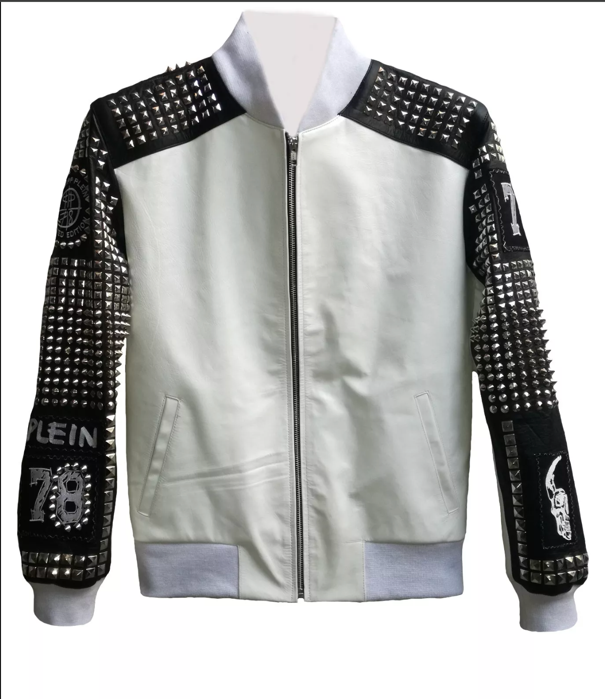 When it comes to making a statement, few pieces of clothing can compete with the fierce style of a men's punk leather jacket. The jacket that is not only functional but also bold and edgy. This studded leather jacket exudes a rebellious attitude with its sleek white body, striking black leather accents, and an array of metallic studs that catch the light, adding a fierce dimension to any outfit. The stark contrast between the crisp white leather and the rugged, studded black patches makes this jacket the perfect representation of punk rock aesthetics.