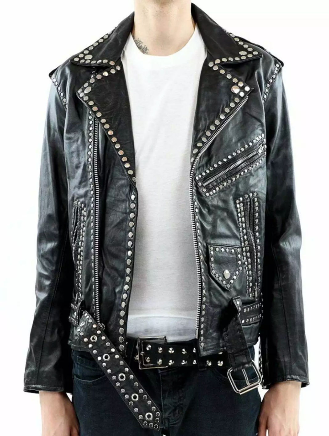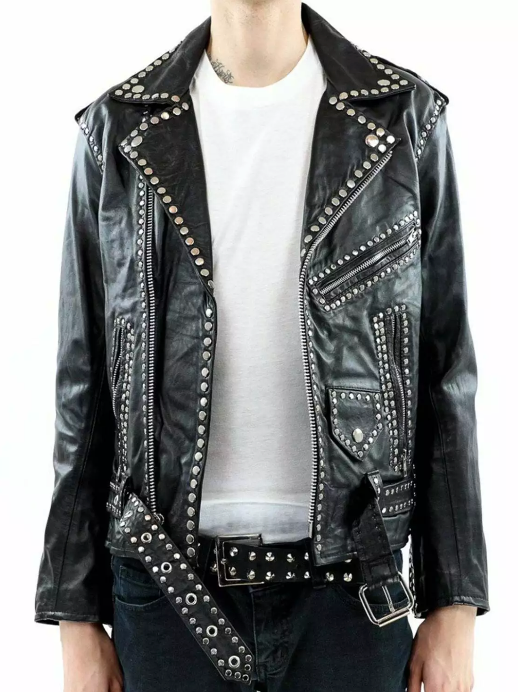 A bold black leather jacket featuring silver studs and spikes, complete with a belted design and punk-inspired zippers for a distinct.