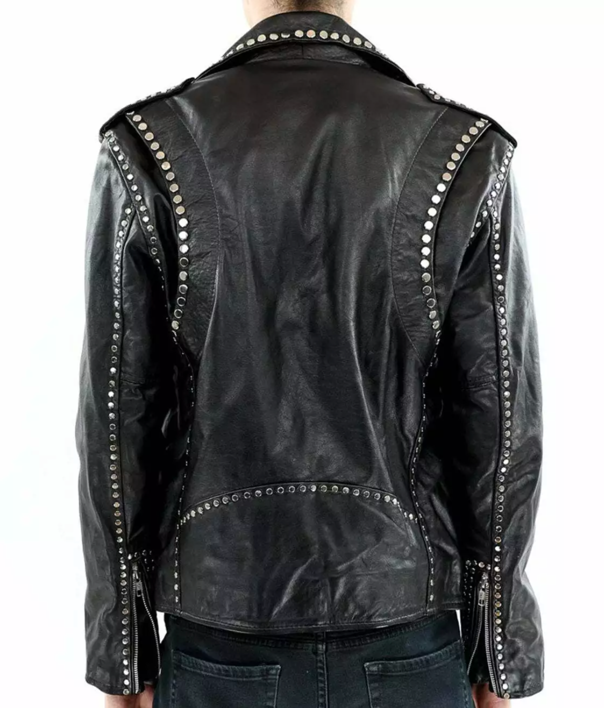 Designed for those who value both style and functionality, the jacket features multiple zippers that add to its punk aesthetic while offering practicality for storage. The waist belt, adorned with matching silver studs, adds to the jacket's biker-inspired design. The adjustable belt not only improves the fit but also contributes to the jacket’s commanding look.