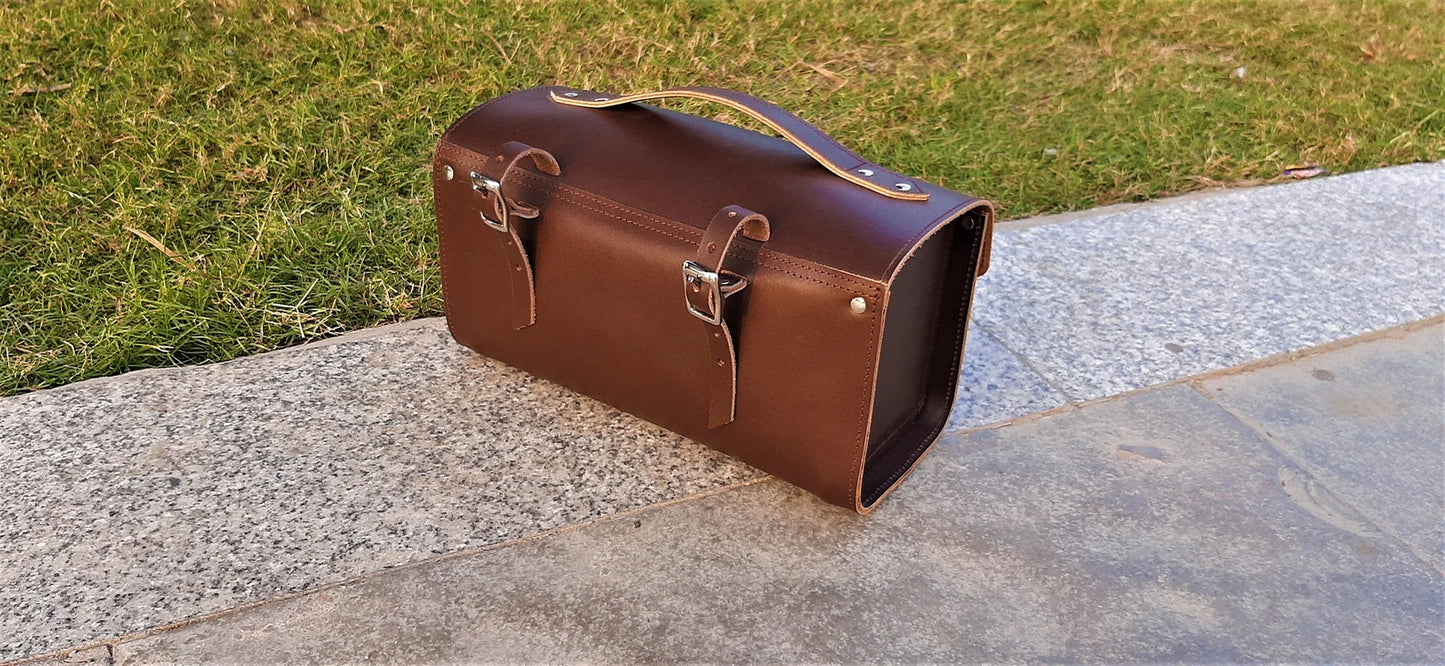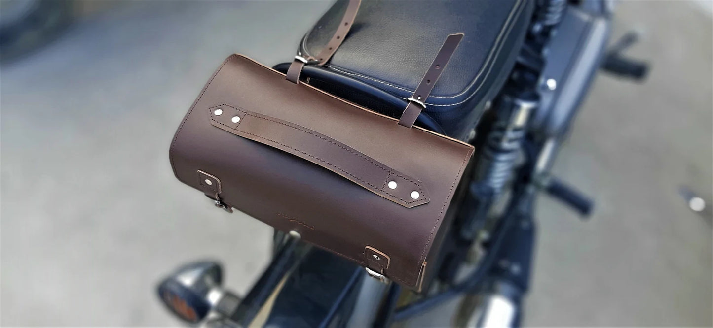 Brown leather tool bag suitable for motorcycles, bicycle panniers, and saddle setups.