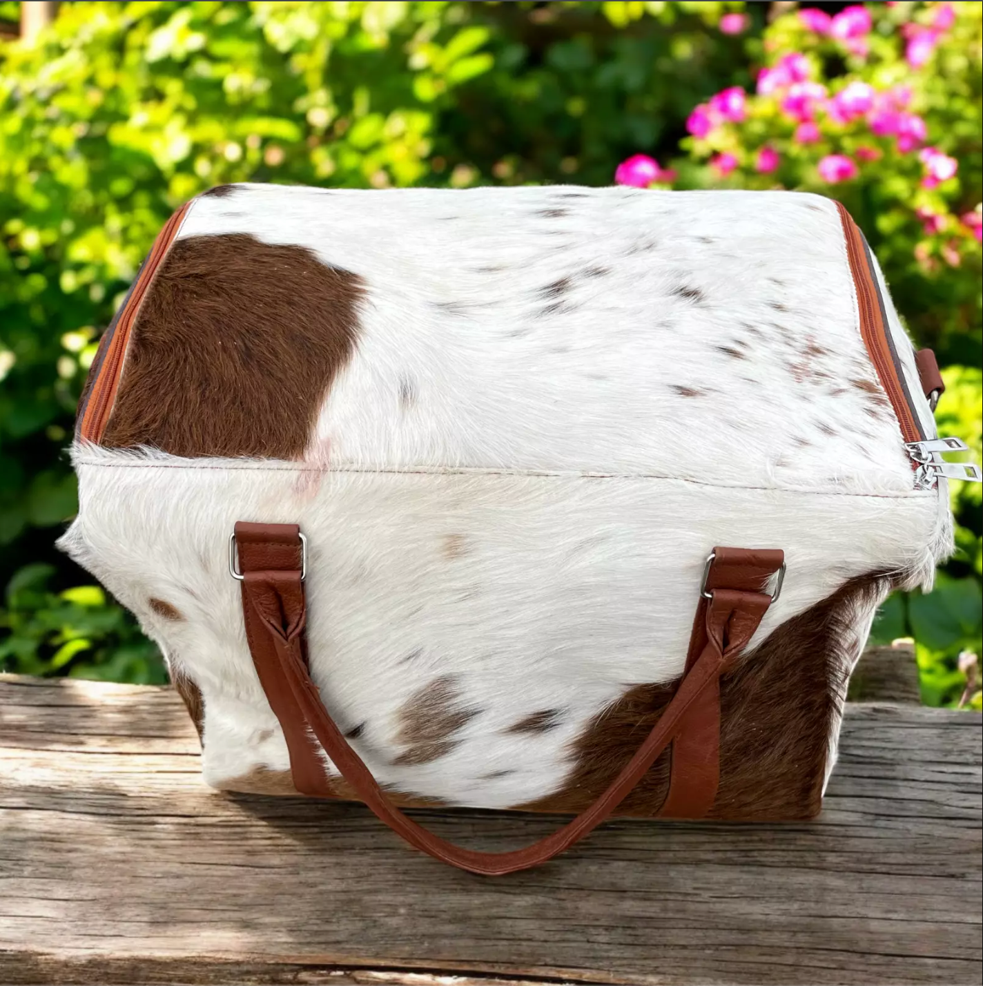Each bag is handmade using natural materials, ensuring every piece is unique. The cowhide pattern on your bag will be similar but not identical to the pictures.