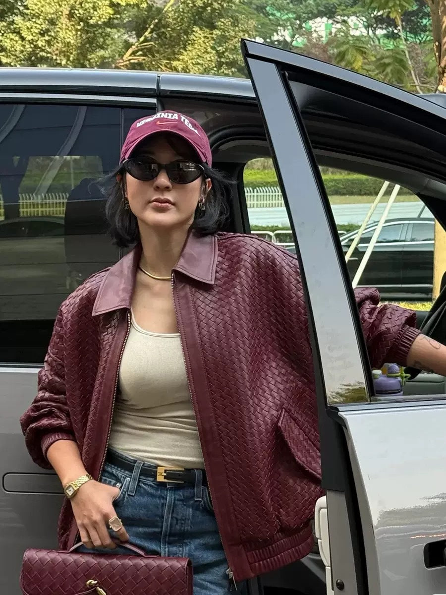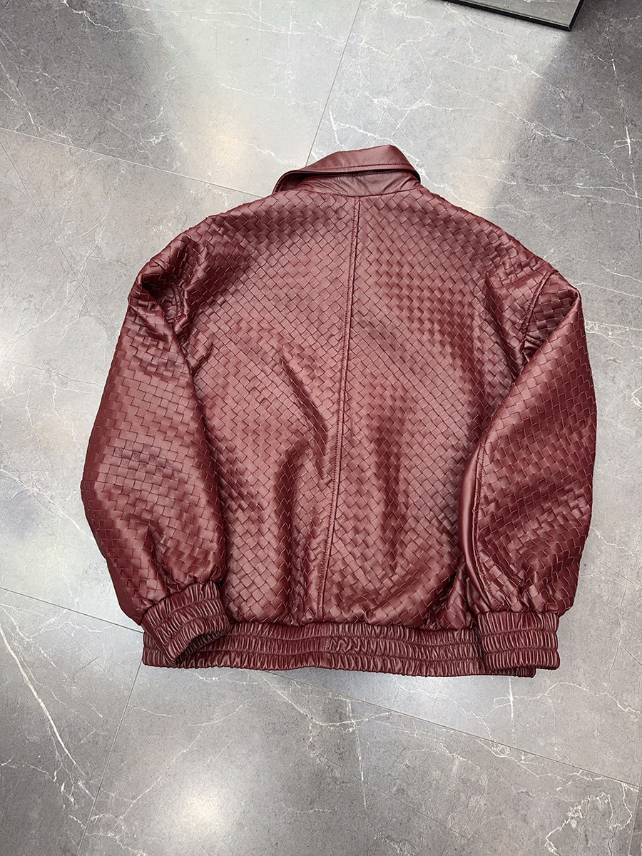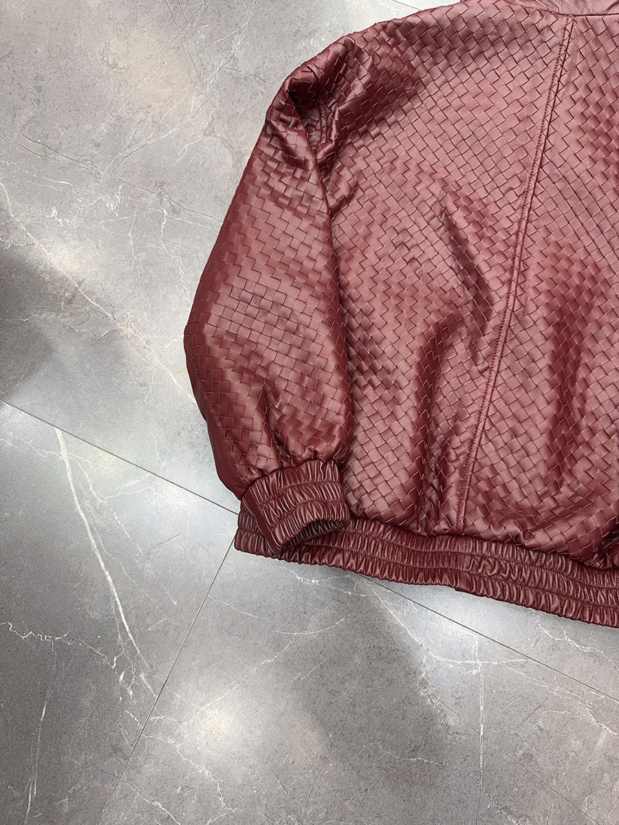 - Burgundy leather jacket women’s design highlights intricate woven sheepskin texture