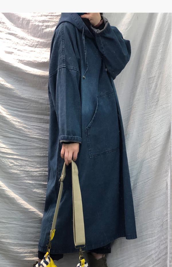 This oversized denim hoodie dress for women is your go-to layer for casual confidence and seasonal coverage. Crafted from heavyweight blue jean fabric, it features a full-length body, long sleeves, a kangaroo pocket, and a drawstring hood — delivering a fashion-forward shape in a laid-back silhouette. Whether you're heading out for errands or layering up for cool-weather travel, this long sleeve women's denim dress is roomy, breathable, and easy to style. The faded blue wash and exposed seamlines give it a worn-in charm that fits the retro forest girl look. Unlike other dresses, this denim hoodie dress for women stands out for its floor-length fit and wide, flowing cut. Perfectly matched with combat boots or sneakers, it creates a relaxed look that commands attention.