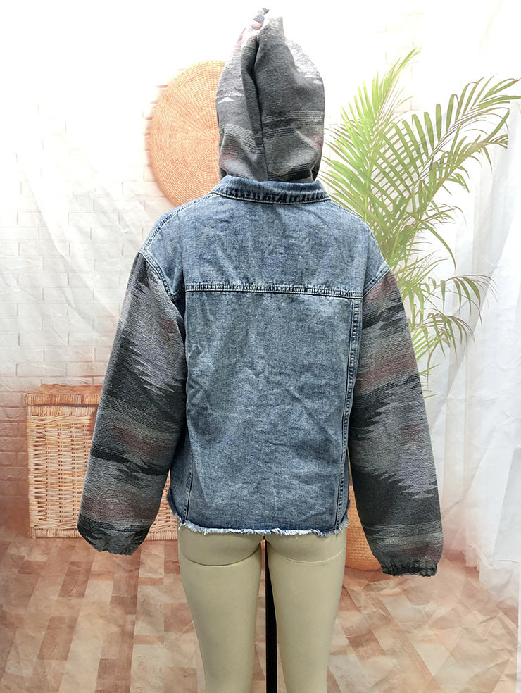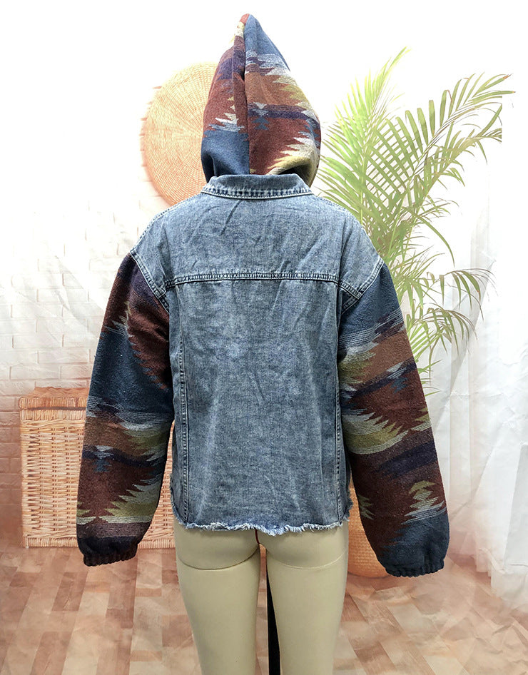 Oversized Patchwork Denim Jacket with Tribal Print and Hood for Women