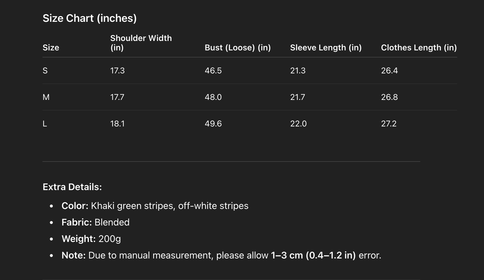 - Each shirt is tailor-made; if you can’t find your size, please select and place the order.