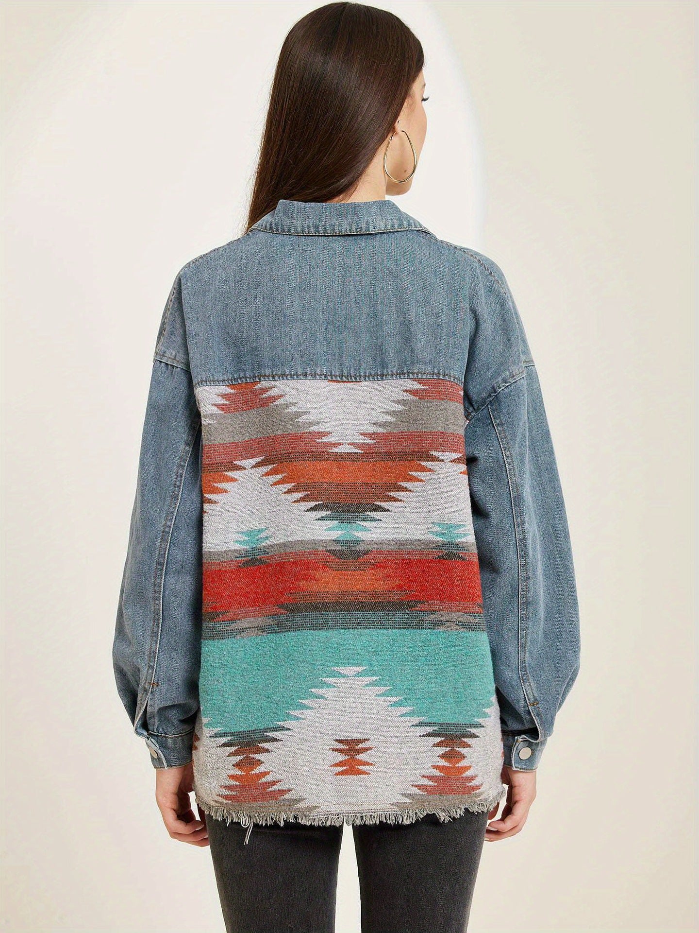 Women's Oversized Jean Jacket with Tribal Woven Design and Frayed Hem