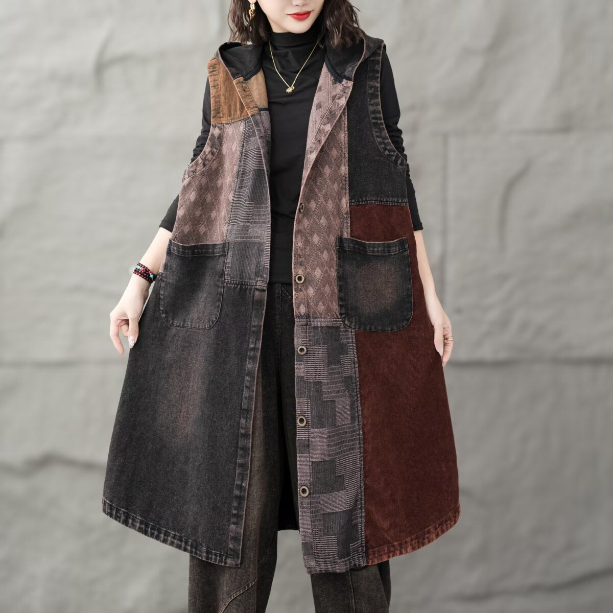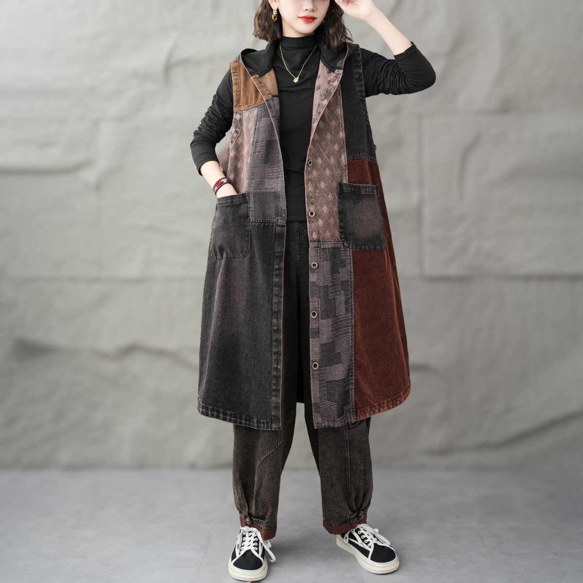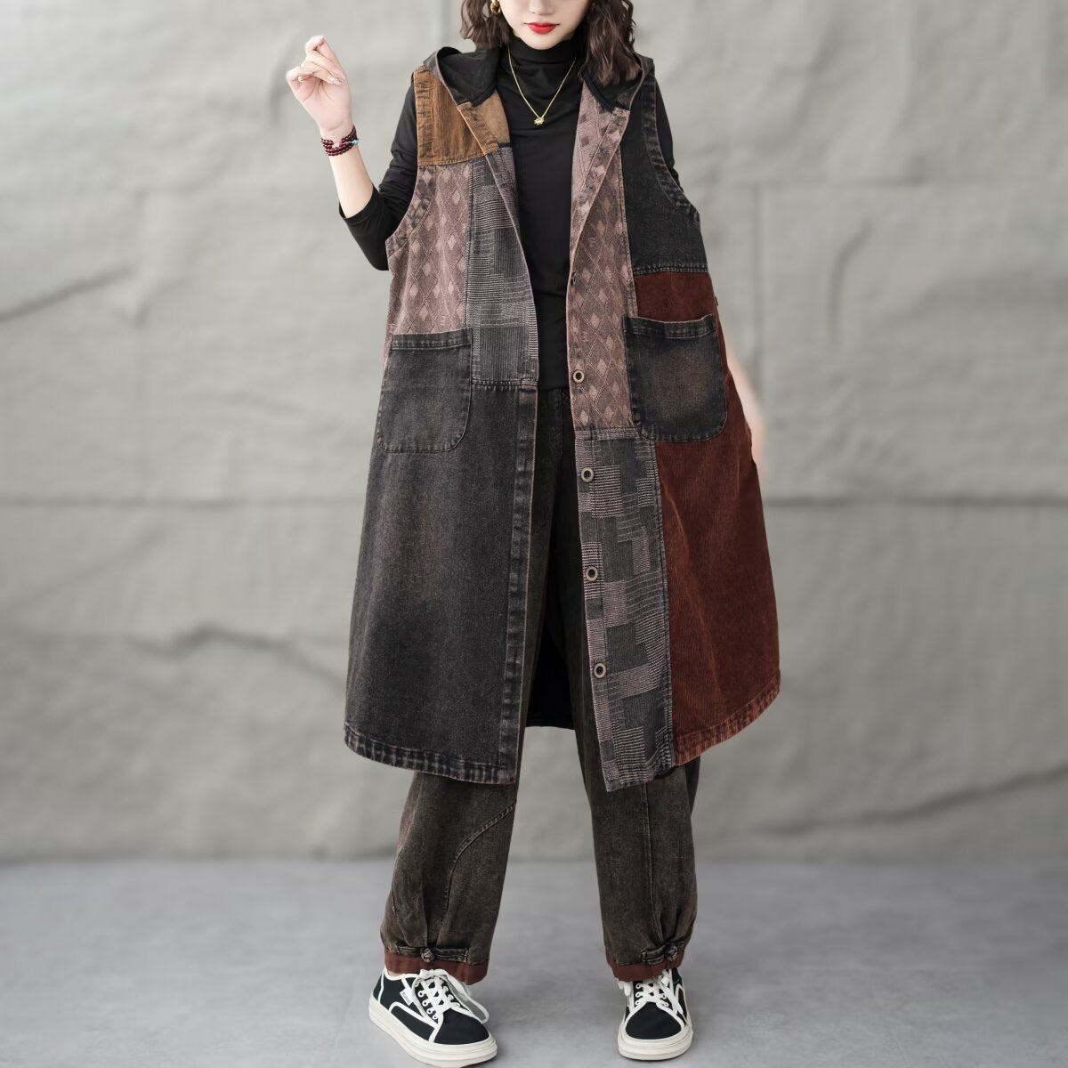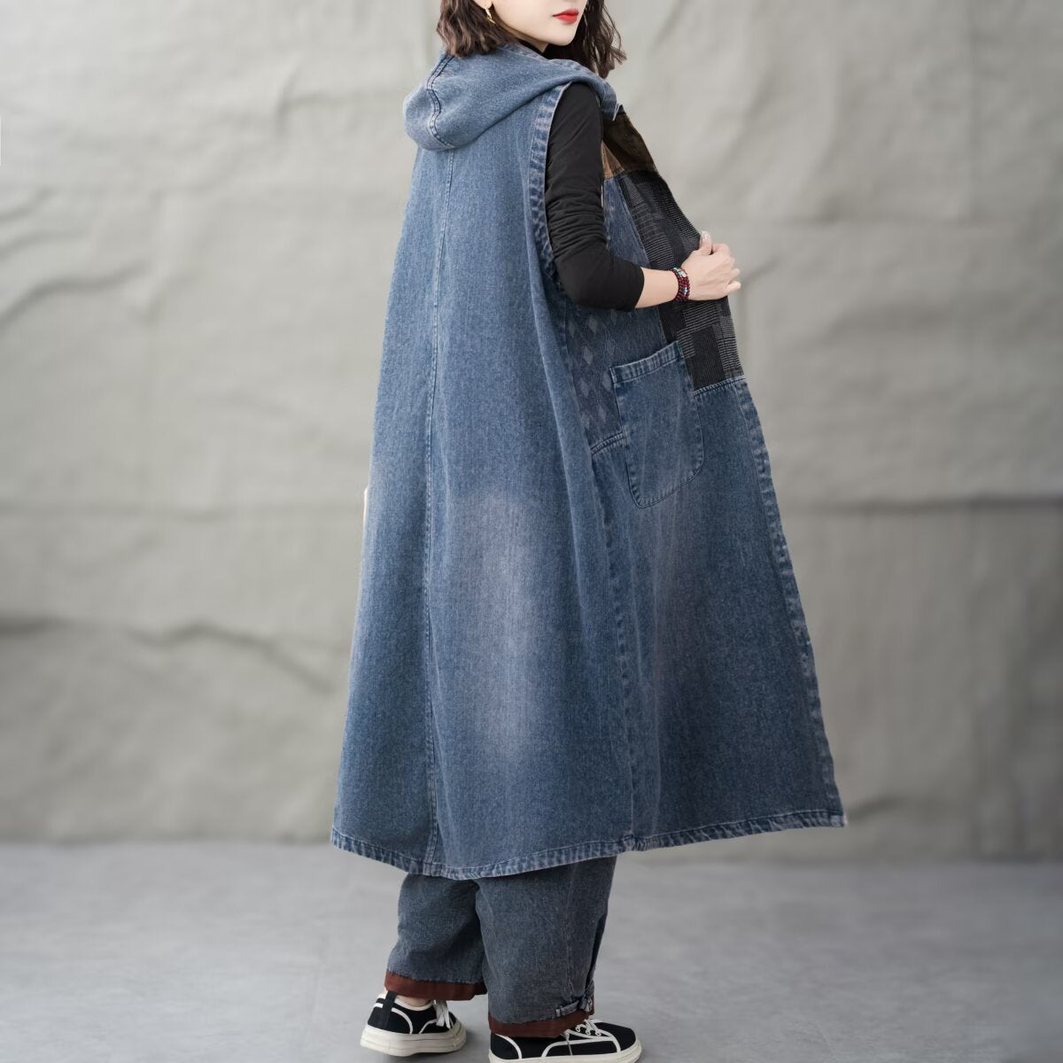 Long Patchwork Hooded Jean Dress for Women – Sleeveless Denim Shirt Vest