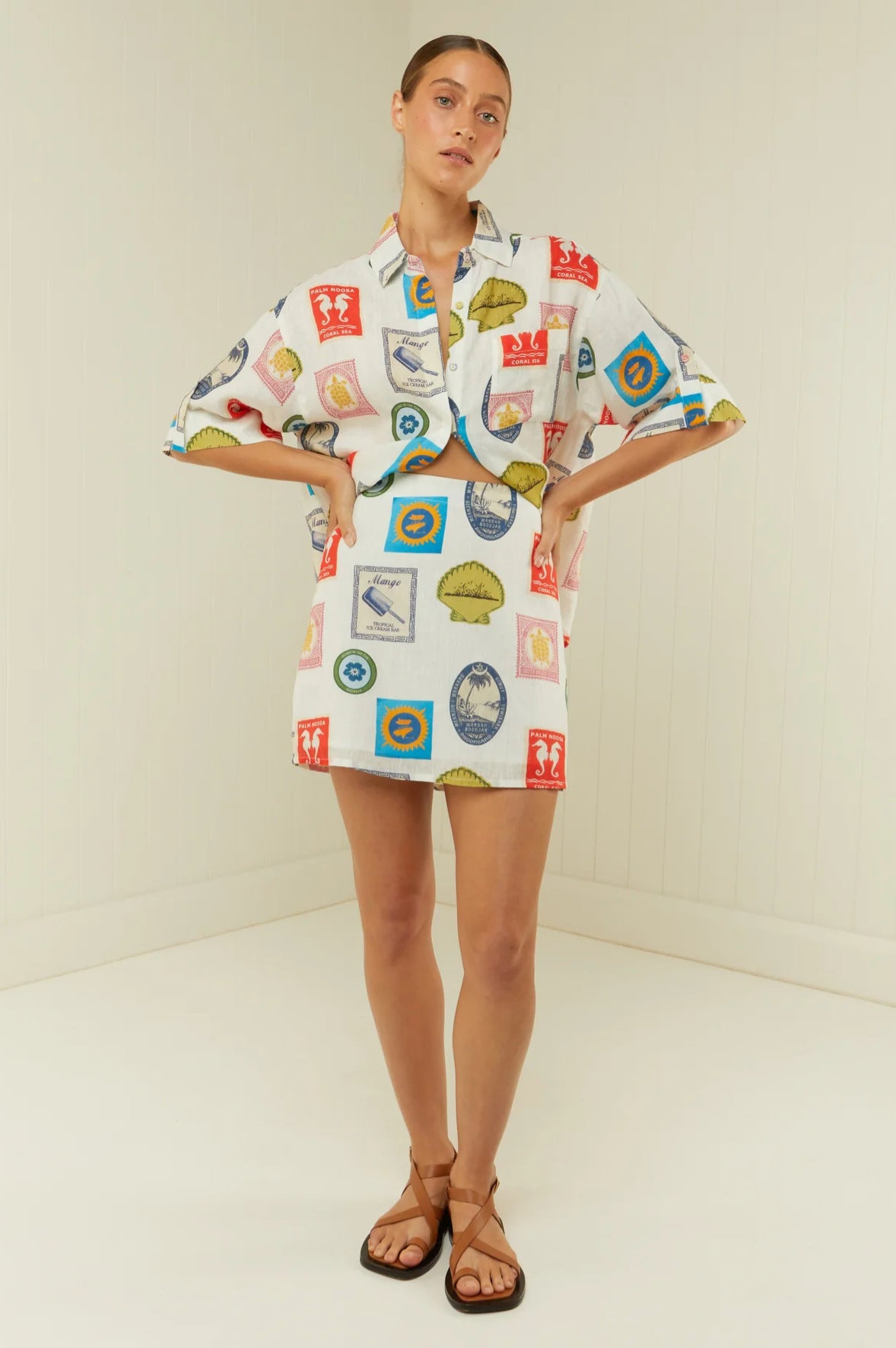 - 100% polyester fabric with vibrant holiday stamp print design inspired by travel and resort wear