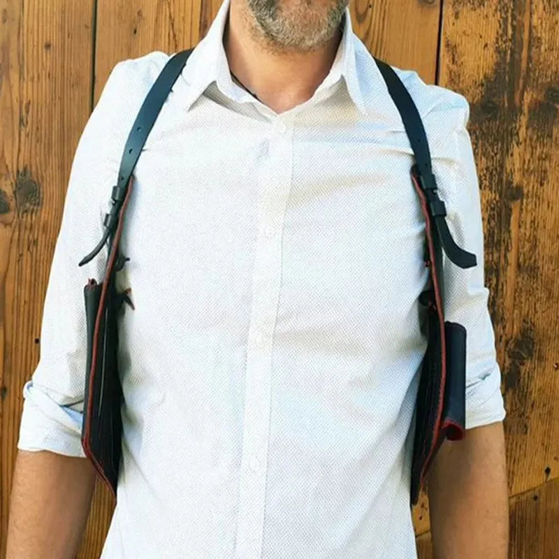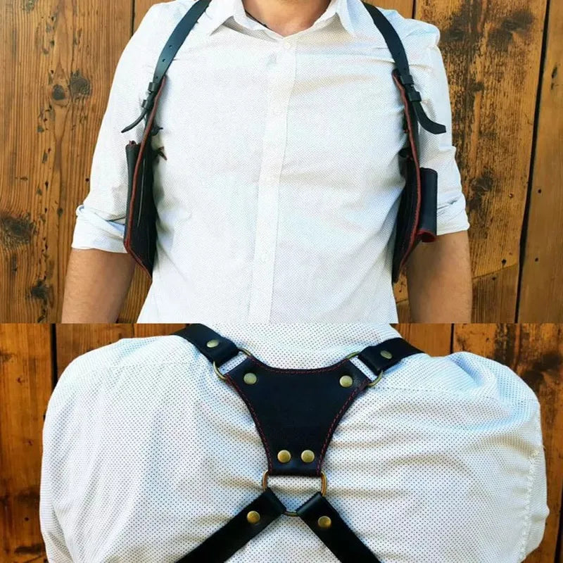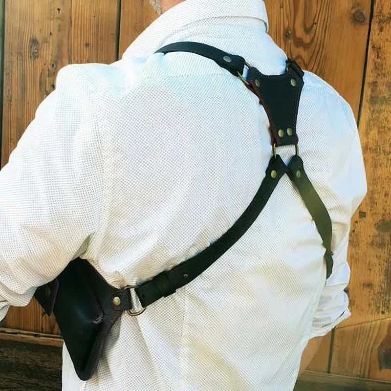 - Handmade leather holster bag for men with crossover chest rig design — adjustable and rugged