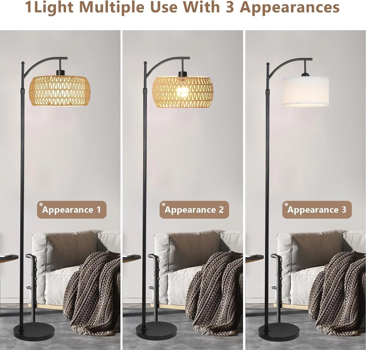 Elevate your space with this unique boho floor lamp, merging handcrafted rattan artistry with modern functionality. This rattan arc floor lamp with remote control features a matte black frame, adjustable height, and 3 lamp shades to swap between for different moods and styles. Use the included dimmable LED bamboo floor lamp for living room to shift light levels and temperatures via the remote—ideal for bedrooms, living rooms, and reading corners.