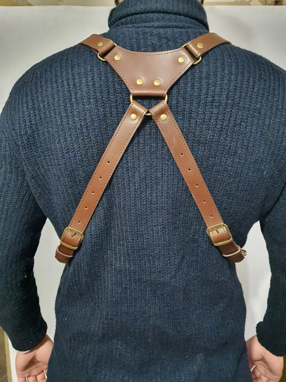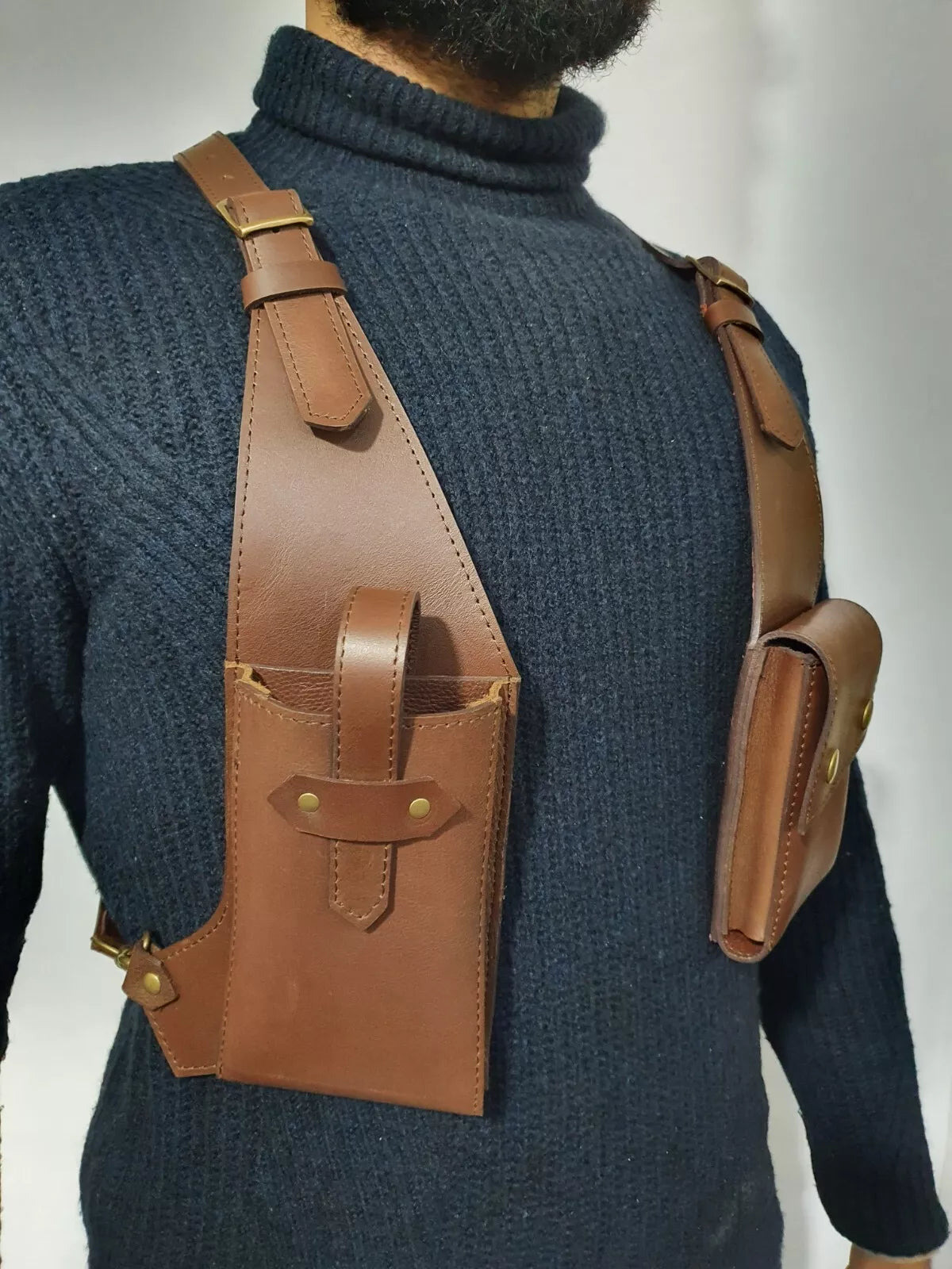 The leather finish gives this shoulder bag holster a rugged yet sophisticated appeal. The natural grain and high-quality craftsmanship enhance its aesthetic, ensuring that it complements various outfits. Pair it with a turtleneck, as shown in the images, or wear it over a casual tee for a relaxed yet put-together look.