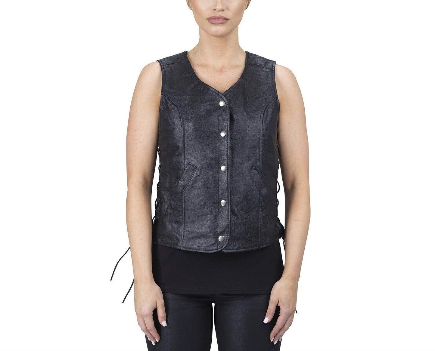 Sleek women's vest featuring a button-front design and lace-up sides, made from premium black lambskin.