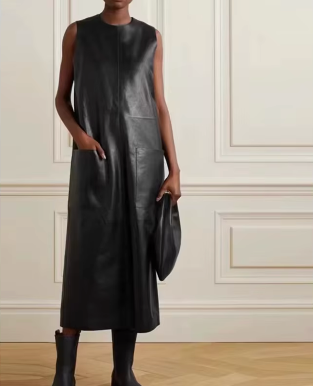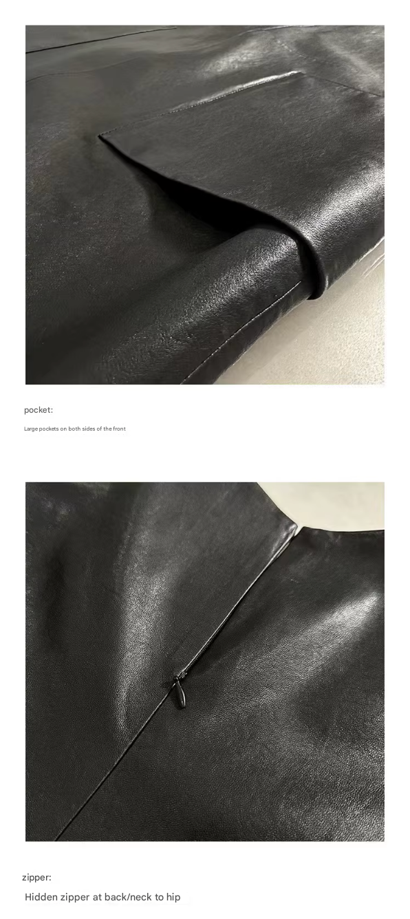 This real leather sleeveless sundress is made from soft sheepskin and designed with a minimalist straight cut that defines urban luxury. The mid-length silhouette highlights smooth panels with inset seams and a hidden back zipper, while oversized pockets bring balance to the design. Ideal for women searching for a real leather sleeveless sundress for women, a genuine leather midi dress, or a women black leather dress with pockets, this piece adapts from daywear to evening layering with ease.
