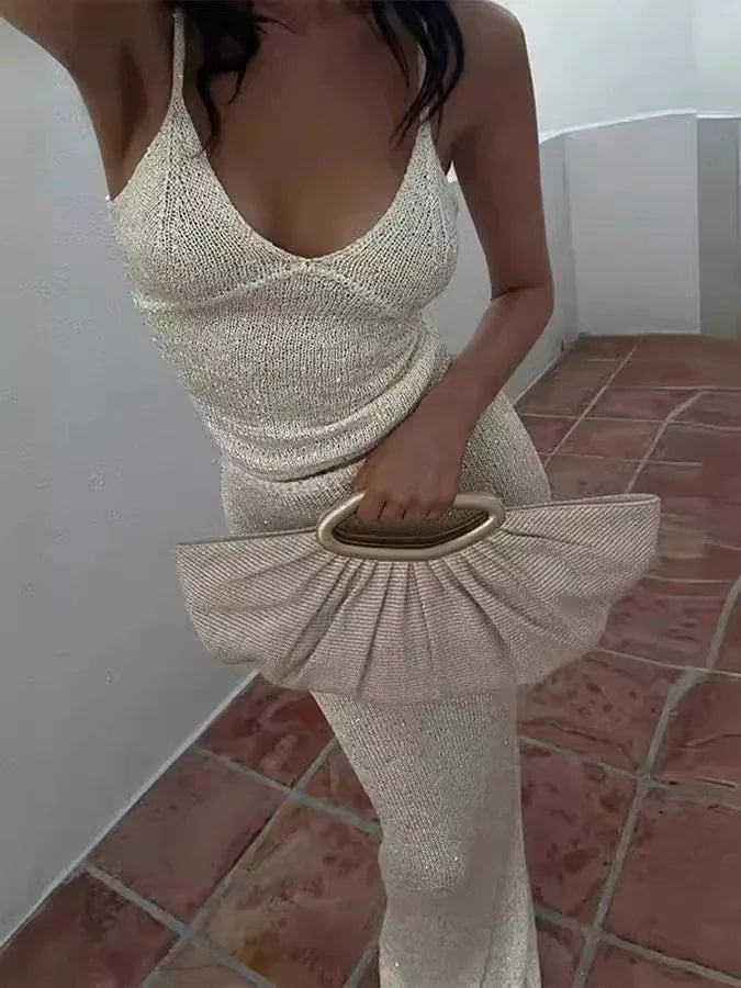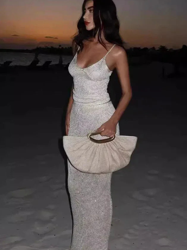 - Two-piece beach suit with slim suspender crop top and high-waist long v skirt designed for warm-weather wear