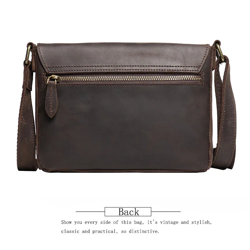 Retro minimalist genuine leather shoulder bag in crazy horse leather for men or women, sized for ipad mini carry. Magnetic snap flap, smooth zipper pocket, adjustable 145 cm strap, and organized interior with an inner zip pouch. Compact crossbody bag profile keeps essentials close while keeping a clean look for daily use.