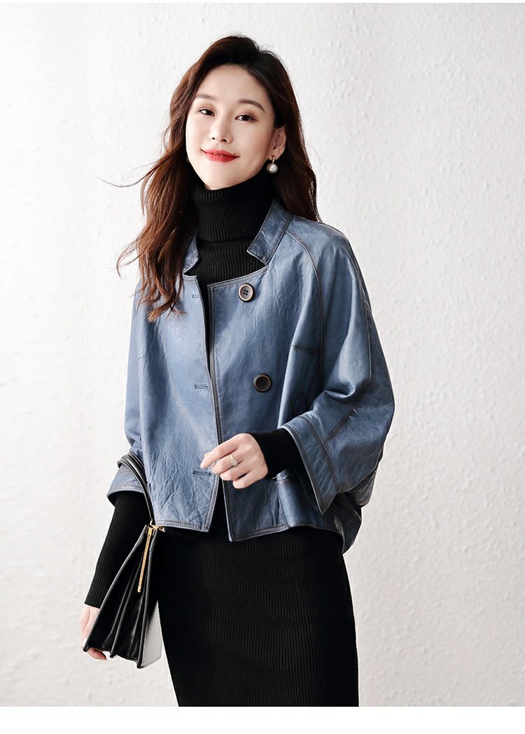 - Loose fit leather jacket for women designed with a cropped length that balances proportions and highlights the waist