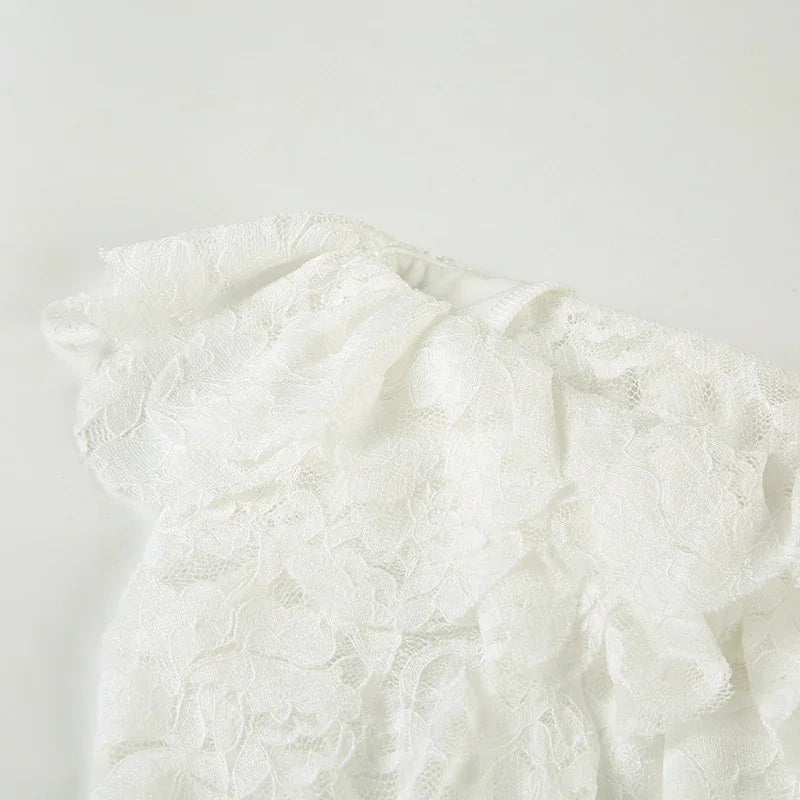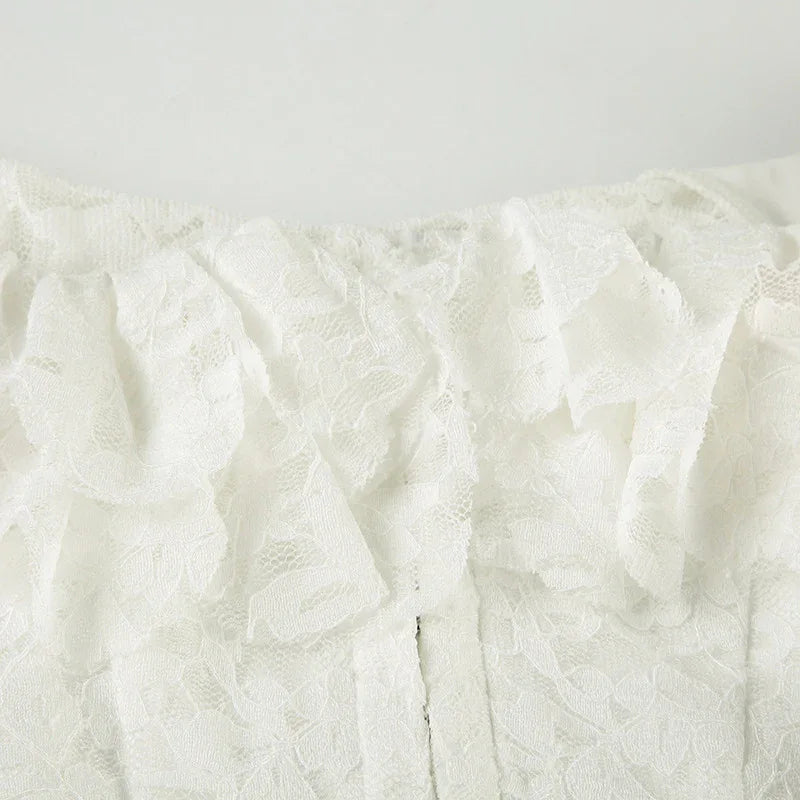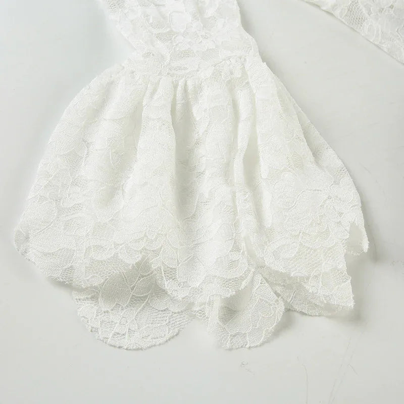 • Petal sleeves feature scalloped lace edges that flare gently at the wrist, mirroring the floral lace fabric displayed in the product images.