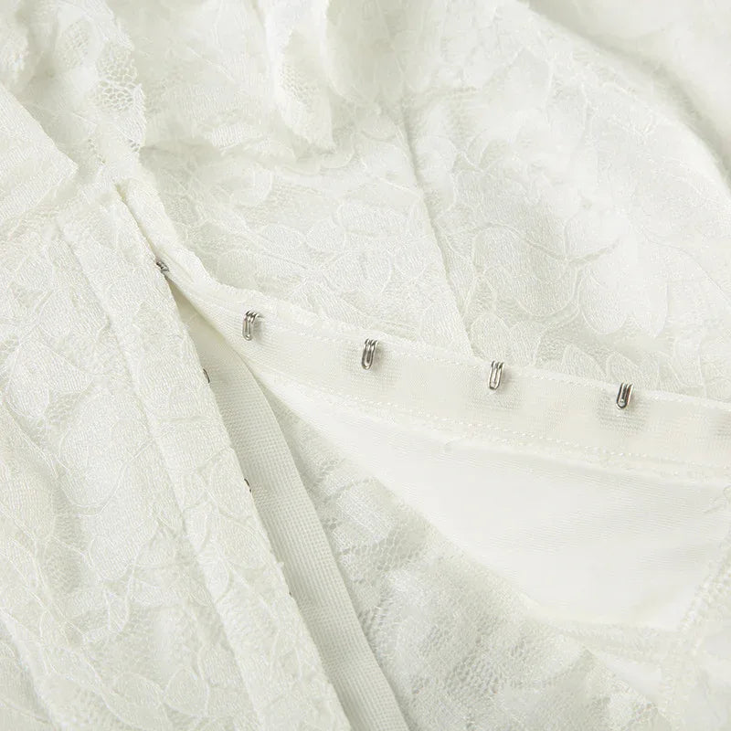 • Front hook-button closure provides a secure center fastening, matching the inner lining and lace structure seen in the close-up shots.