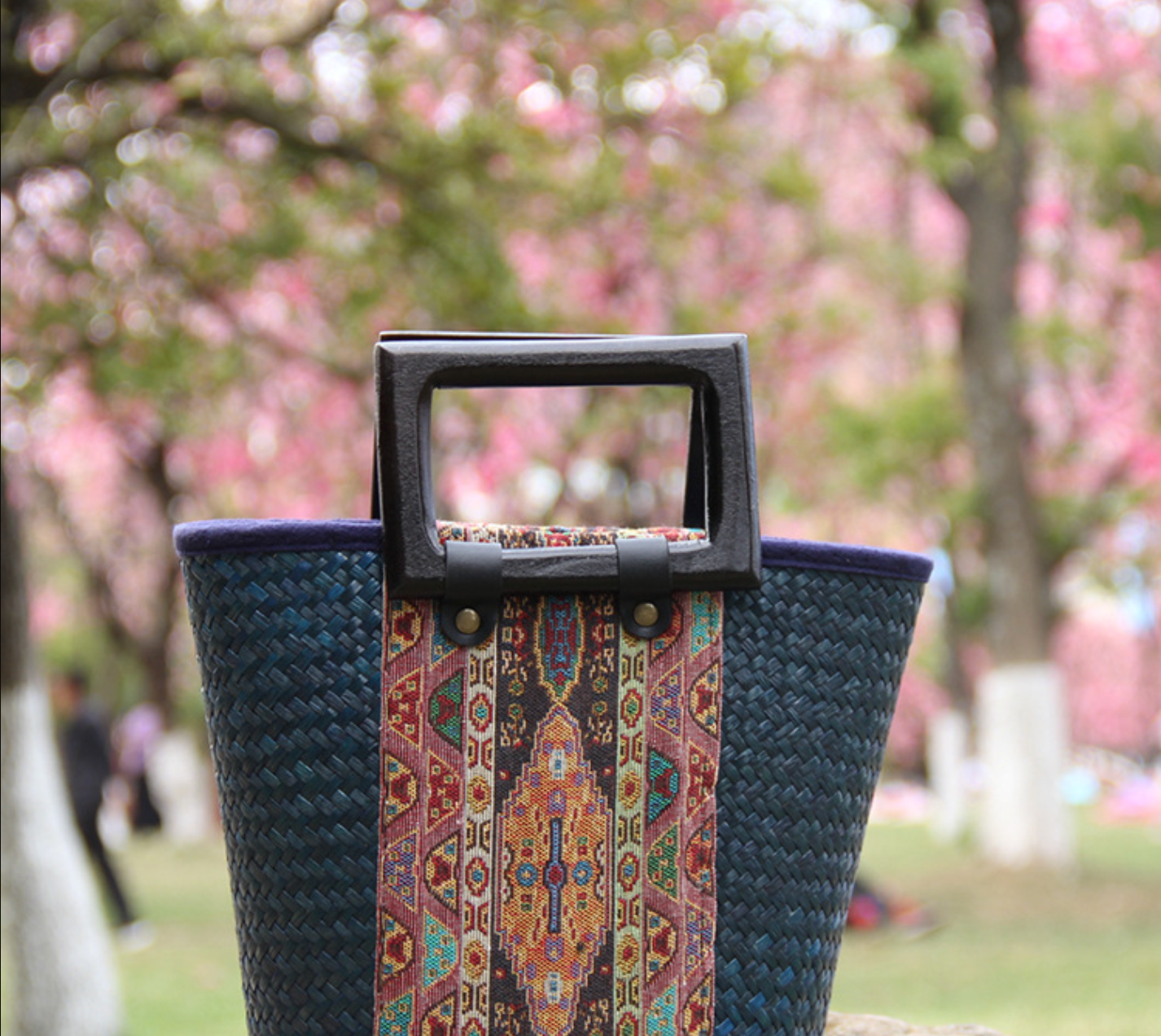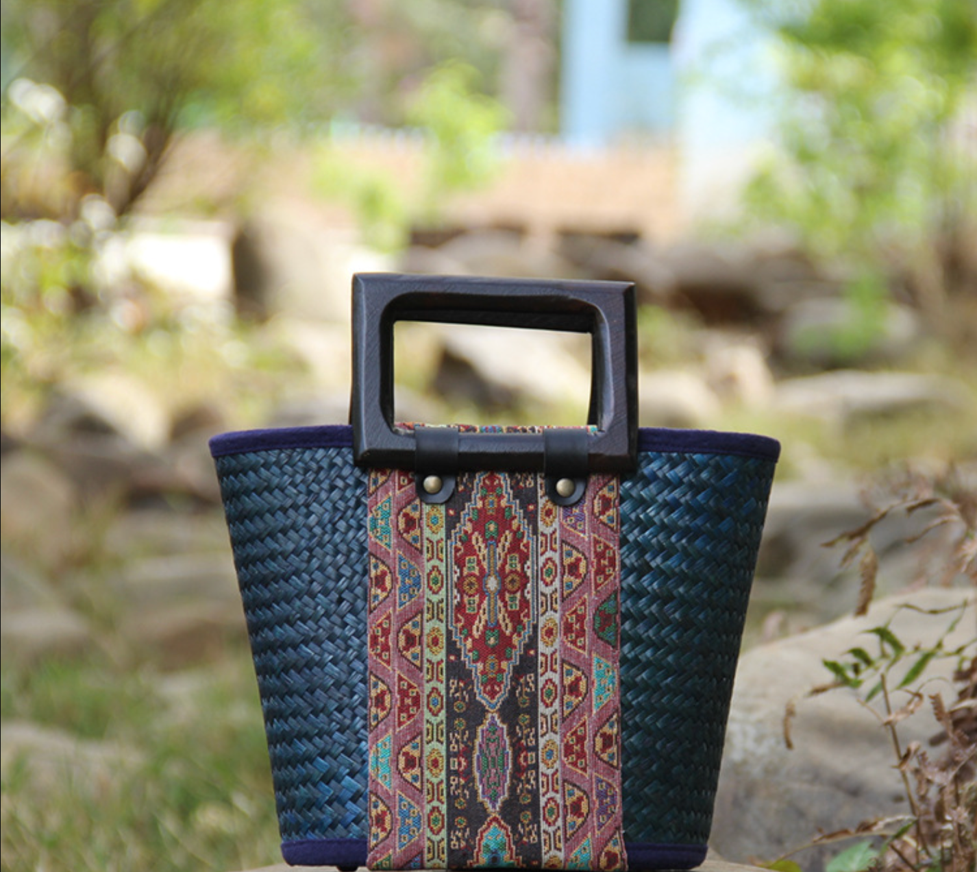 The retro woven women’s rattan handbag combines natural artistry with a modern edge. Each handmade straw handbag with wooden handle features tightly woven seaweed fibers accented by a vibrant ethnic-patterned fabric that draws the eye instantly. The structured frame keeps its shape while brass-tone details add refinement. Designed for summer days, outdoor gatherings, and travel, this rattan women’s bag brings cultural charm and functionality together. Lightweight, breathable, and crafted for long-lasting daily use, it’s a perfect statement piece for any outfit — a collectible accessory made to stand out in every season.