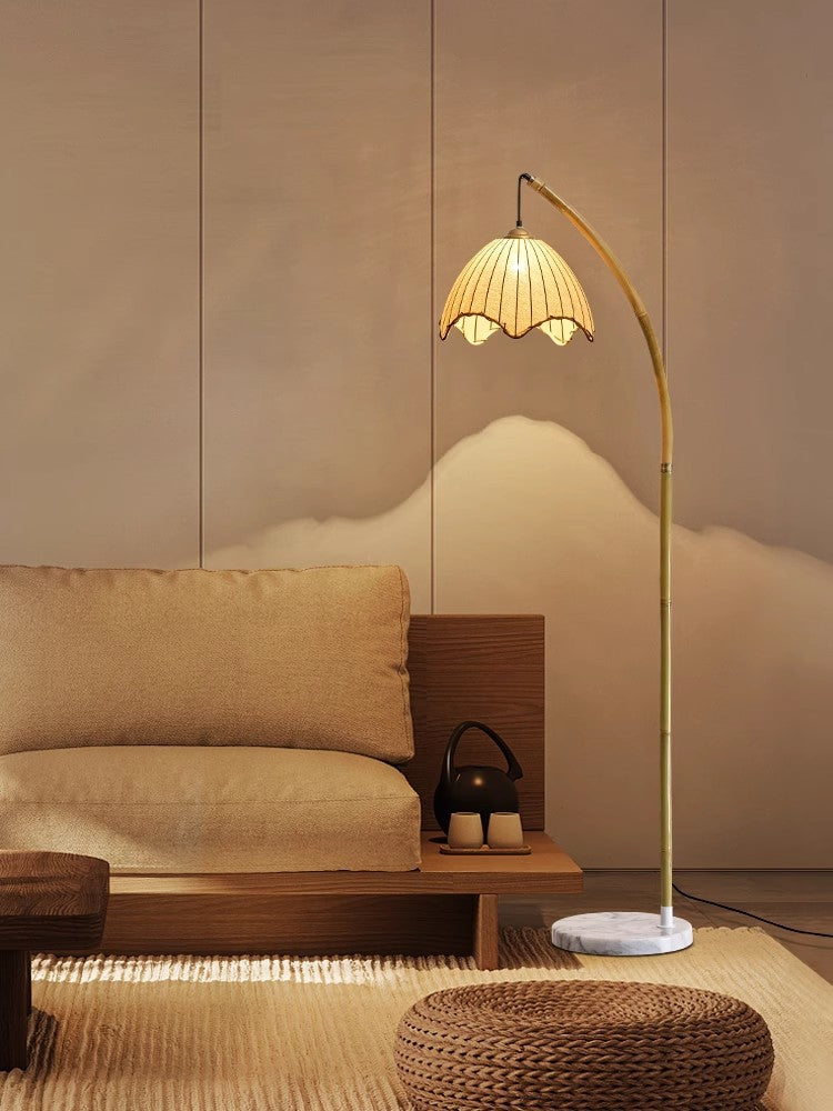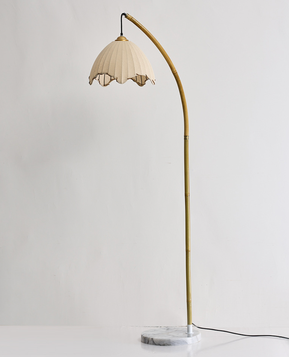 - Handmade bamboo floor lamp with an arched design stands 160cm tall and features a 30cm scalloped lampshade