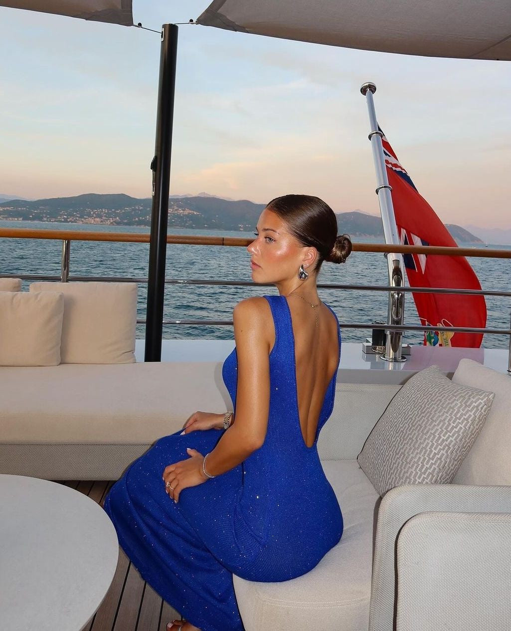 • Fine shimmer accents woven through the blue knit add a soft sparkle effect that catches natural sunlight and low-light yacht settings.