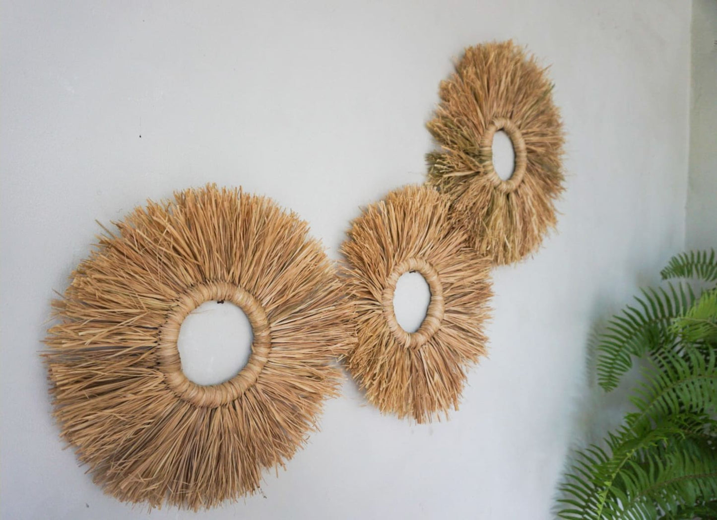 Add a touch of nature to your space with this beautiful round wall decor featuring fringe made from seagrass and palm leaves.