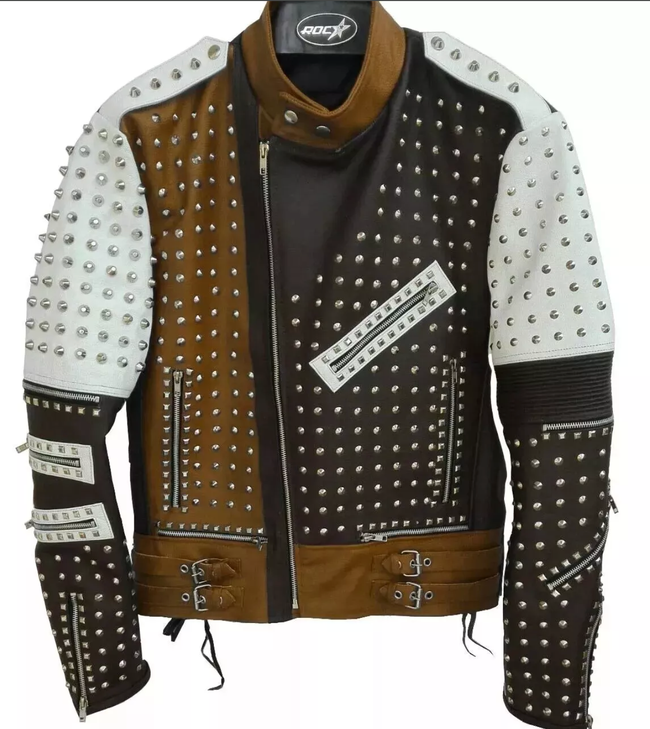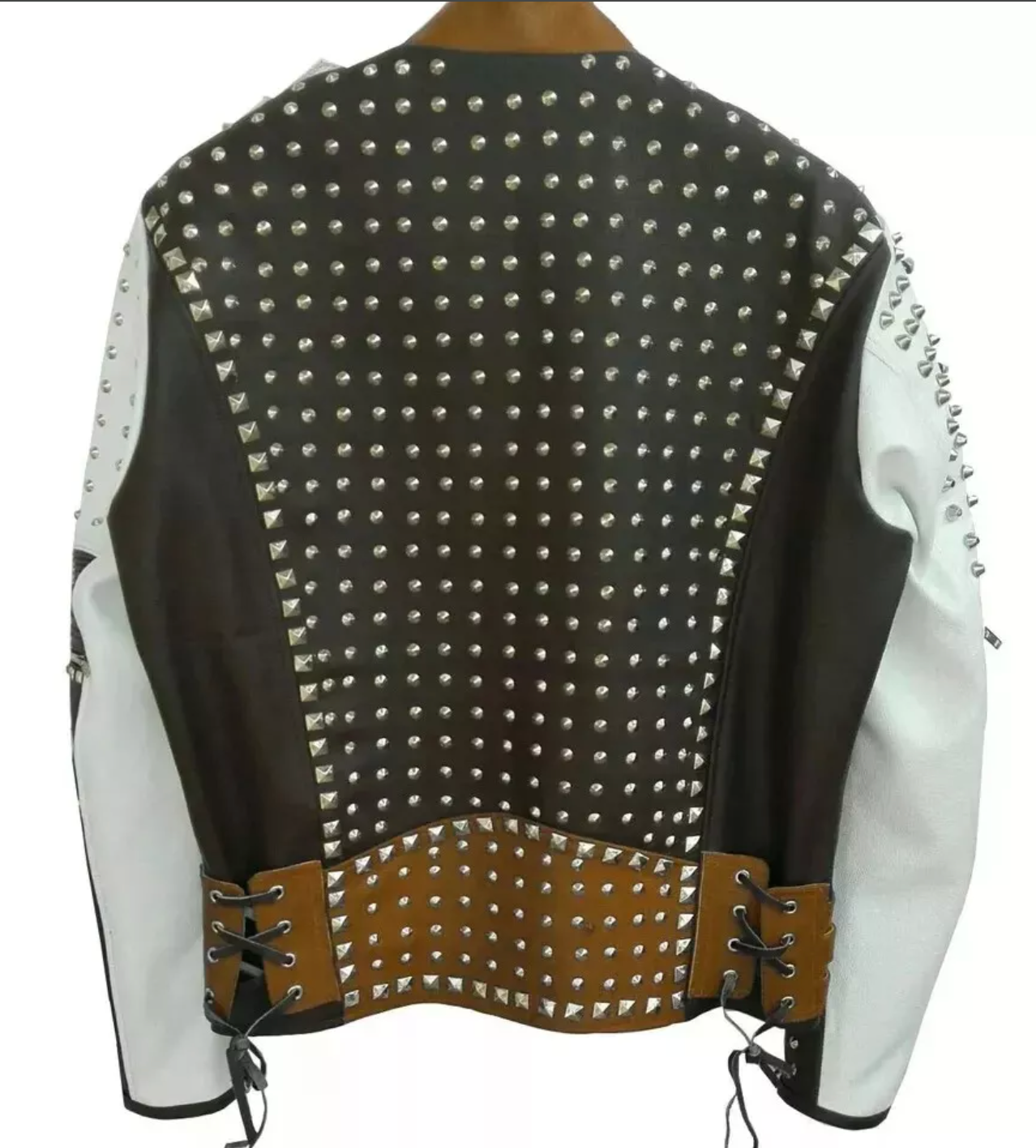 This leather jacket studded masterpiece combines brown, black, and white leather in a way that’s both creative and unique. The jacket’s back and front panel feature a mix of black and brown leather, while the sleeves are designed in contrasting white. This tri-tone combination adds dimension and versatility, making the jacket suitable for a variety of outfits and occasions. Whether you pair it with dark jeans or wear it over a simple shirt, this jacket will bring an instant attitude to your look.