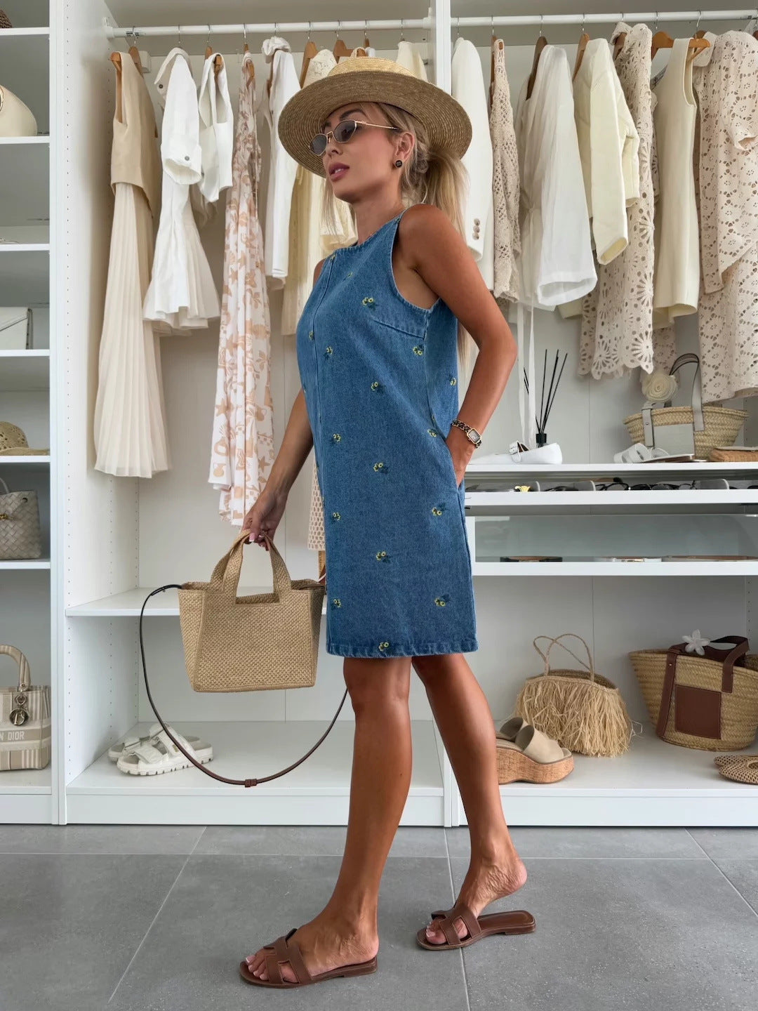 - Sleeveless denim dress women with floral embroidery for a feminine casual look