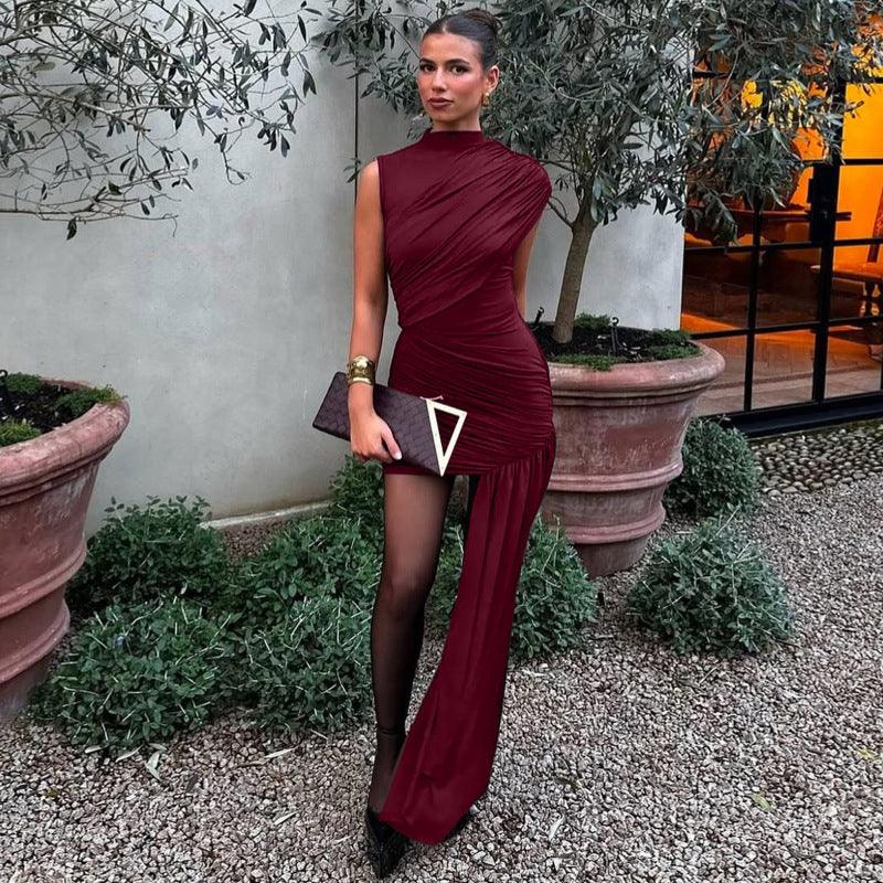• One-shoulder draped shape adds a sculpted fit, featuring a sleeveless cut and a high neckline that mirrors the refined silhouette shown.