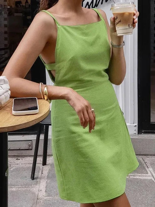 Square neck suspender dress in fresh green with slim straps and a clean mini silhouette. This women summer mini dress features a secure back strap and side open detail for a modern look. Wear it as a commuter dress for work days, coffee runs, and weekends. A lightweight square neck dress that pairs easily with sandals, flats, or heels.
